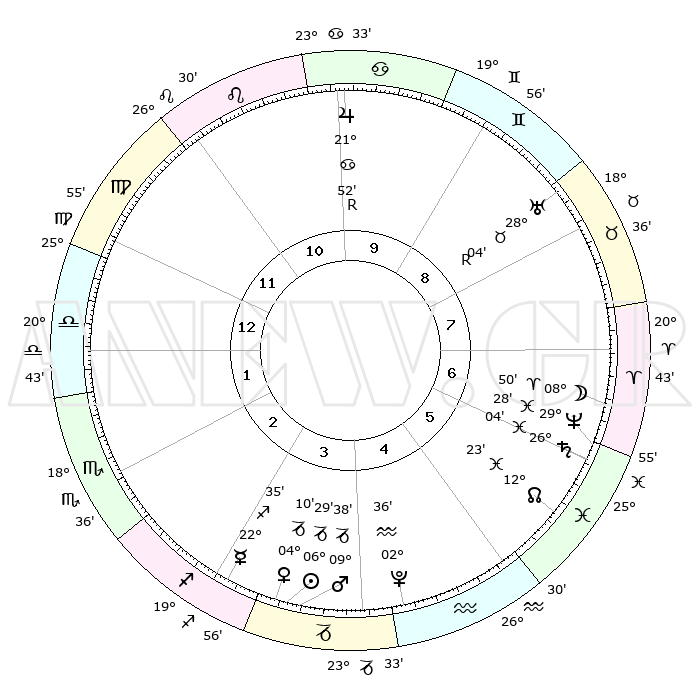 | | ΘΕΣΕΙΣ ΠΛΑΝΗΤΩΝ ΑΣΤΡΟΛΟΓΙΚΟΥ ΧΑΡΤΗ ΤΗΣ ΣΤΙΓΜΗΣ ΑΥΤΗΣ | | | | Πλανήτης | Ζώδιο | Μοίρες | Δεκαήμ. | Σε οίκο | Απόκλιση | | Ακμές των οίκων | | Ηλιος | Αιγόκερως | 06°25' | Πρώτο | 4 | 23 S 17 | | 1ος | 01°31' | Ζυγός | | Σελήνη | Κριός | 07°57' | Πρώτο | 7 | 05 N 15 | | 2ος | 28°13' | Ζυγός | | Ερμής | Τοξότης | 22°29' | Τρίτο | 3 | 23 S 19 | | 3ος | 28°42' | Σκορπιός | | Αφροδίτη | Αιγόκερως | 04°05' | Πρώτο | 4 | 23 S 43 | | 4ος | 01°42' | Αιγόκερως | | Αρης | Αιγόκερως | 09°35' | Πρώτο | 4 | 23 S 57 | | 5ος | 04°40' | Υδροχόος | | Δίας | Καρκίνος | 21°53'R | Τρίτο | 10 | 21 N 53 | | 6ος | 05°02' | Ιχθείς | | Κρόνος | Ιχθείς | 26°04' | Τρίτο | 6 | 03 S 39 | | 7ος | 01°31' | Κριός | | Ουρανός | Ταύρος | 28°04'R | Τρίτο | 8 | 19 N 32 | | 8ος | 28°13' | Κριός | | Ποσειδώνας | Ιχθείς | 29°28' | Τρίτο | 6 | 01 S 26 | | 9ος | 28°42' | Ταύρος | | Πλούτωνας | Υδροχόος | 02°36' | Πρώτο | 4 | 23 S 15 | | 10ος | 01°42' | Καρκίνος | | Β. Δεσμός | Ιχθείς | 12°23' | Δεύτερο | 6 | 06 S 55 | | 11ος | 04°40' | Λέων | | Ωροσκόπος | Ζυγός | 01°31' | Πρώτο | | | 12ος | 05°02' | Παρθένος | | Μεσουράνημα | Καρκίνος | 01°42' | Πρώτο | | | |