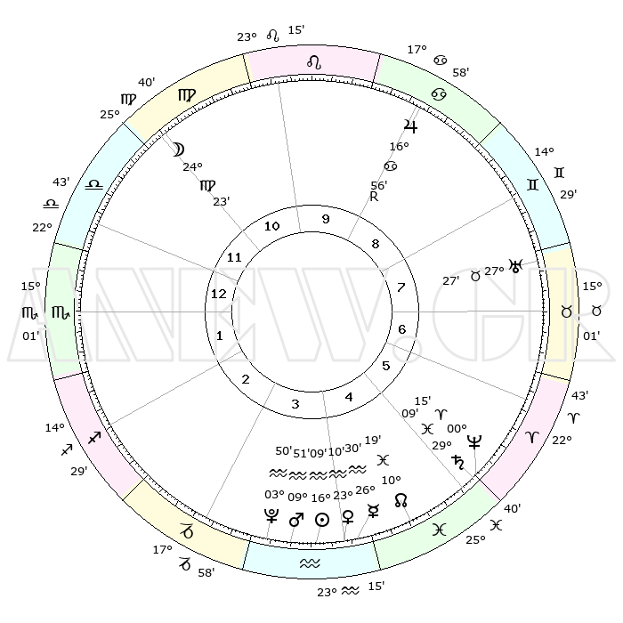 | | ΘΕΣΕΙΣ ΠΛΑΝΗΤΩΝ ΑΣΤΡΟΛΟΓΙΚΟΥ ΧΑΡΤΗ ΤΗΣ ΣΤΙΓΜΗΣ ΑΥΤΗΣ | | | | Πλανήτης | Ζώδιο | Μοίρες | Δεκαήμ. | Σε οίκο | Απόκλιση | | Ακμές των οίκων | | Ηλιος | Υδροχόος | 16°04' | Δεύτερο | 4 | 16 S 01 | | 1ος | 21°48' | Ζυγός | | Σελήνη | Παρθένος | 23°21' | Τρίτο | 11 | 01 N 27 | | 2ος | 19°45' | Σκορπιός | | Ερμής | Υδροχόος | 26°22' | Τρίτο | 4 | 14 S 12 | | 3ος | 21°08' | Τοξότης | | Αφροδίτη | Υδροχόος | 23°04' | Τρίτο | 4 | 15 S 10 | | 4ος | 24°49' | Αιγόκερως | | Αρης | Υδροχόος | 09°47' | Πρώτο | 4 | 18 S 49 | | 5ος | 27°47' | Υδροχόος | | Δίας | Καρκίνος | 16°56'R | Δεύτερο | 9 | 22 N 40 | | 6ος | 27°06' | Ιχθείς | | Κρόνος | Ιχθείς | 29°09' | Τρίτο | 6 | 02 S 20 | | 7ος | 21°48' | Κριός | | Ουρανός | Ταύρος | 27°27' | Τρίτο | 8 | 19 N 24 | | 8ος | 19°45' | Ταύρος | | Ποσειδώνας | Κριός | 00°15' | Πρώτο | 6 | 01 S 06 | | 9ος | 21°08' | Δίδυμοι | | Πλούτωνας | Υδροχόος | 03°49' | Πρώτο | 4 | 23 S 00 | | 10ος | 24°49' | Καρκίνος | | Β. Δεσμός | Ιχθείς | 10°19' | Δεύτερο | 5 | 07 S 42 | | 11ος | 27°47' | Λέων | | Ωροσκόπος | Ζυγός | 21°48' | Τρίτο | | | 12ος | 27°06' | Παρθένος | | Μεσουράνημα | Καρκίνος | 24°49' | Τρίτο | | | |