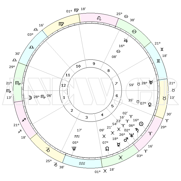 | | ΘΕΣΕΙΣ ΠΛΑΝΗΤΩΝ ΑΣΤΡΟΛΟΓΙΚΟΥ ΧΑΡΤΗ ΤΗΣ ΣΤΙΓΜΗΣ ΑΥΤΗΣ | | | | Πλανήτης | Ζώδιο | Μοίρες | Δεκαήμ. | Σε οίκο | Απόκλιση | | Ακμές των οίκων | | Ηλιος | Κριός | 15°58' | Δεύτερο | 6 | 06 N 17 | | 1ος | 02°07' | Σκορπιός | | Σελήνη | Σκορπιός | 27°19' | Τρίτο | 1 | 24 S 29 | | 2ος | 00°39' | Τοξότης | | Ερμής | Ιχθείς | 18°17' | Δεύτερο | 5 | 06 S 25 | | 3ος | 02°47' | Αιγόκερως | | Αφροδίτη | Ταύρος | 07°30' | Πρώτο | 7 | 13 N 47 | | 4ος | 07°07' | Υδροχόος | | Αρης | Ιχθείς | 26°51' | Τρίτο | 5 | 02 S 12 | | 5ος | 10°00' | Ιχθείς | | Δίας | Καρκίνος | 16°07' | Δεύτερο | 9 | 22 N 50 | | 6ος | 08°29' | Κριός | | Κρόνος | Κριός | 06°15' | Πρώτο | 5 | 00 N 31 | | 7ος | 02°07' | Ταύρος | | Ουρανός | Ταύρος | 28°59' | Τρίτο | 7 | 19 N 46 | | 8ος | 00°39' | Δίδυμοι | | Ποσειδώνας | Κριός | 02°23' | Πρώτο | 5 | 00 S 15 | | 9ος | 02°47' | Καρκίνος | | Πλούτωνας | Υδροχόος | 05°17' | Πρώτο | 3 | 22 S 47 | | 10ος | 07°07' | Λέων | | Β. Δεσμός | Ιχθείς | 07°09' | Πρώτο | 4 | 08 S 53 | | 11ος | 10°00' | Παρθένος | | Ωροσκόπος | Σκορπιός | 02°07' | Πρώτο | | | 12ος | 08°29' | Ζυγός | | Μεσουράνημα | Λέων | 07°07' | Πρώτο | | | |
