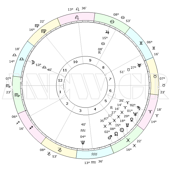 | | ΘΕΣΕΙΣ ΠΛΑΝΗΤΩΝ ΑΣΤΡΟΛΟΓΙΚΟΥ ΧΑΡΤΗ ΤΗΣ ΣΤΙΓΜΗΣ ΑΥΤΗΣ | | | | Πλανήτης | Ζώδιο | Μοίρες | Δεκαήμ. | Σε οίκο | Απόκλιση | | Ακμές των οίκων | | Ηλιος | Ιχθείς | 15°13' | Δεύτερο | 5 | 05 S 49 | | 1ος | 20°11' | Ζυγός | | Σελήνη | Ζυγός | 12°56' | Δεύτερο | 12 | 07 S 49 | | 2ος | 18°02' | Σκορπιός | | Ερμής | Ιχθείς | 18°30'R | Δεύτερο | 5 | 01 S 09 | | 3ος | 19°20' | Τοξότης | | Αφροδίτη | Ιχθείς | 29°12' | Τρίτο | 6 | 01 S 29 | | 4ος | 22°56' | Αιγόκερως | | Αρης | Ιχθείς | 02°32' | Πρώτο | 5 | 11 S 35 | | 5ος | 25°53' | Υδροχόος | | Δίας | Καρκίνος | 15°08'R | Δεύτερο | 9 | 22 N 55 | | 6ος | 25°19' | Ιχθείς | | Κρόνος | Κριός | 02°25' | Πρώτο | 6 | 01 S 00 | | 7ος | 20°11' | Κριός | | Ουρανός | Ταύρος | 27°51' | Τρίτο | 8 | 19 N 30 | | 8ος | 18°02' | Ταύρος | | Ποσειδώνας | Κριός | 01°13' | Πρώτο | 6 | 00 S 43 | | 9ος | 19°20' | Δίδυμοι | | Πλούτωνας | Υδροχόος | 04°40' | Πρώτο | 4 | 22 S 51 | | 10ος | 22°56' | Καρκίνος | | Β. Δεσμός | Ιχθείς | 08°47' | Πρώτο | 5 | 08 S 16 | | 11ος | 25°53' | Λέων | | Ωροσκόπος | Ζυγός | 20°11' | Τρίτο | | | 12ος | 25°19' | Παρθένος | | Μεσουράνημα | Καρκίνος | 22°56' | Τρίτο | | | |