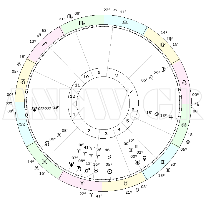 | | ΘΕΣΕΙΣ ΠΛΑΝΗΤΩΝ ΑΣΤΡΟΛΟΓΙΚΟΥ ΧΑΡΤΗ ΤΗΣ ΣΤΙΓΜΗΣ ΑΥΤΗΣ | | | | Πλανήτης | Ζώδιο | Μοίρες | Δεκαήμ. | Σε οίκο | Απόκλιση | | Ακμές των οίκων | | Ηλιος | Ταύρος | 05°42' | Πρώτο | 4 | 13 N 25 | | 1ος | 06°14' | Αιγόκερως | | Σελήνη | Λέων | 28°15' | Τρίτο | 8 | 12 N 50 | | 2ος | 14°59' | Υδροχόος | | Ερμής | Κριός | 16°52' | Δεύτερο | 3 | 04 N 26 | | 3ος | 25°16' | Ιχθείς | | Αφροδίτη | Δίδυμοι | 02°08' | Πρώτο | 5 | 21 N 14 | | 4ος | 28°08' | Κριός | | Αρης | Κριός | 12°29' | Δεύτερο | 3 | 04 N 05 | | 5ος | 23°30' | Ταύρος | | Δίας | Καρκίνος | 18°14' | Δεύτερο | 7 | 22 N 35 | | 6ος | 14°58' | Δίδυμοι | | Κρόνος | Κριός | 08°41' | Πρώτο | 3 | 01 N 27 | | 7ος | 06°14' | Καρκίνος | | Ουρανός | Ταύρος | 29°60' | Τρίτο | 5 | 19 N 59 | | 8ος | 14°59' | Λέων | | Ποσειδώνας | Κριός | 03°06' | Πρώτο | 3 | 00 N 01 | | 9ος | 25°16' | Παρθένος | | Πλούτωνας | Υδροχόος | 05°29' | Πρώτο | 1 | 22 S 48 | | 10ος | 28°08' | Ζυγός | | Β. Δεσμός | Ιχθείς | 06°05' | Πρώτο | 2 | 09 S 17 | | 11ος | 23°30' | Σκορπιός | | Ωροσκόπος | Αιγόκερως | 06°14' | Πρώτο | | | 12ος | 14°58' | Τοξότης | | Μεσουράνημα | Ζυγός | 28°08' | Τρίτο | | | |