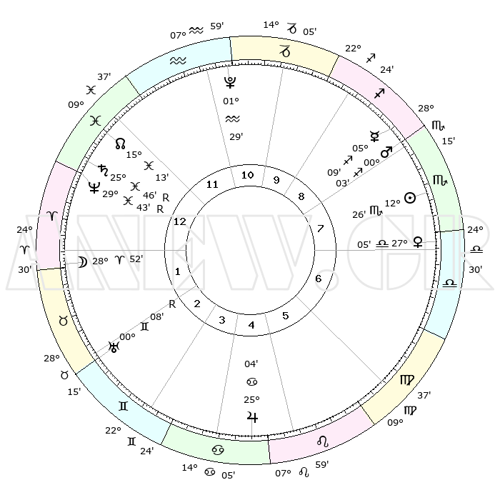 |  | ΘΕΣΕΙΣ ΠΛΑΝΗΤΩΝ ΑΣΤΡΟΛΟΓΙΚΟΥ ΧΑΡΤΗ ΤΗΣ ΣΤΙΓΜΗΣ ΑΥΤΗΣ |  |   |  | Πλανήτης | Ζώδιο | Μοίρες | Δεκαήμ. | Σε οίκο | Απόκλιση |   | Ακμές των οίκων |  | Ηλιος | Σκορπιός | 12°13' | Δεύτερο | 10 | 15 S 30 |   | 1ος | 08°51' | Αιγόκερως |  | Σελήνη | Κριός | 25°40' | Τρίτο | 3 | 12 N 53 |   | 2ος | 18°17' | Υδροχόος |  | Ερμής | Τοξότης | 05°01' | Πρώτο | 11 | 23 S 56 |   | 3ος | 28°35' | Ιχθείς |  | Αφροδίτη | Ζυγός | 26°49' | Τρίτο | 9 | 09 S 00 |   | 4ος | 00°58' | Ταύρος |  | Αρης | Σκορπιός | 29°54' | Τρίτο | 11 | 20 S 32 |   | 5ος | 25°58' | Ταύρος |  | Δίας | Καρκίνος | 25°04' | Τρίτο | 7 | 21 N 12 |   | 6ος | 17°20' | Δίδυμοι |  | Κρόνος | Ιχθείς | 25°47'R | Τρίτο | 2 | 03 S 56 |   | 7ος | 08°51' | Καρκίνος |  | Ουρανός | Δίδυμοι | 00°08'R | Πρώτο | 5 | 19 N 58 |   | 8ος | 18°17' | Λέων |  | Ποσειδώνας | Ιχθείς | 29°43'R | Τρίτο | 3 | 01 S 22 |   | 9ος | 28°35' | Παρθένος |  | Πλούτωνας | Υδροχόος | 01°29' | Πρώτο | 1 | 23 S 30 |   | 10ος | 00°58' | Σκορπιός |  | Β. Δεσμός | Ιχθείς | 15°13' | Δεύτερο | 2 | 05 S 49 |   | 11ος | 25°58' | Σκορπιός |  | Ωροσκόπος | Αιγόκερως | 08°51' | Πρώτο |   |   | 12ος | 17°20' | Τοξότης |  | Μεσουράνημα | Σκορπιός | 00°58' | Πρώτο |   |   |   |