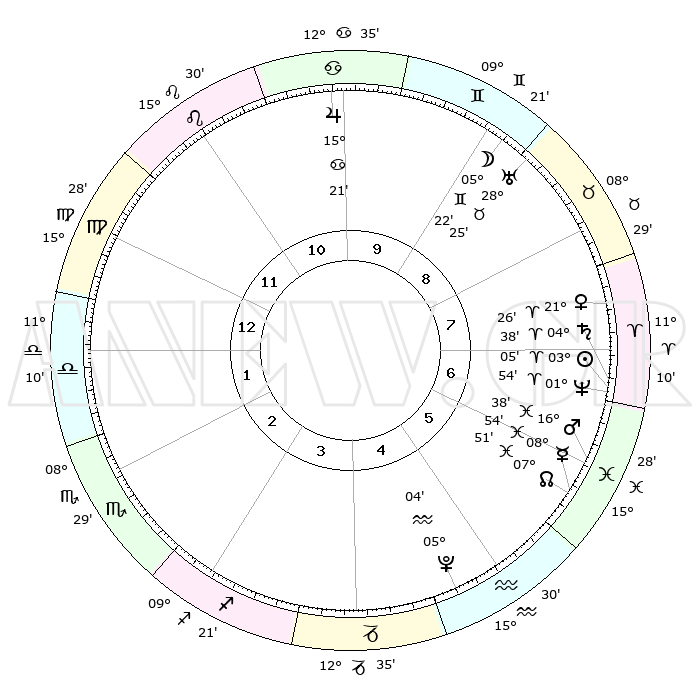 | | ΘΕΣΕΙΣ ΠΛΑΝΗΤΩΝ ΑΣΤΡΟΛΟΓΙΚΟΥ ΧΑΡΤΗ ΤΗΣ ΣΤΙΓΜΗΣ ΑΥΤΗΣ | | | | Πλανήτης | Ζώδιο | Μοίρες | Δεκαήμ. | Σε οίκο | Απόκλιση | | Ακμές των οίκων | | Ηλιος | Κριός | 03°01' | Πρώτο | 7 | 01 N 12 | | 1ος | 22°32' | Παρθένος | | Σελήνη | Δίδυμοι | 04°28' | Πρώτο | 9 | 26 N 09 | | 2ος | 18°32' | Ζυγός | | Ερμής | Ιχθείς | 08°53' | Πρώτο | 6 | 07 S 57 | | 3ος | 18°40' | Σκορπιός | | Αφροδίτη | Κριός | 21°21' | Τρίτο | 8 | 07 N 37 | | 4ος | 21°36' | Τοξότης | | Αρης | Ιχθείς | 16°35' | Δεύτερο | 6 | 06 S 17 | | 5ος | 24°43' | Αιγόκερως | | Δίας | Καρκίνος | 15°20' | Δεύτερο | 10 | 22 N 55 | | 6ος | 25°26' | Υδροχόος | | Κρόνος | Κριός | 04°37' | Πρώτο | 7 | 00 S 07 | | 7ος | 22°32' | Ιχθείς | | Ουρανός | Ταύρος | 28°25' | Τρίτο | 9 | 19 N 38 | | 8ος | 18°32' | Κριός | | Ποσειδώνας | Κριός | 01°54' | Πρώτο | 7 | 00 S 27 | | 9ος | 18°40' | Ταύρος | | Πλούτωνας | Υδροχόος | 05°04' | Πρώτο | 5 | 22 S 48 | | 10ος | 21°36' | Δίδυμοι | | Β. Δεσμός | Ιχθείς | 07°51' | Πρώτο | 6 | 08 S 38 | | 11ος | 24°43' | Καρκίνος | | Ωροσκόπος | Παρθένος | 22°32' | Τρίτο | | | 12ος | 25°26' | Λέων | | Μεσουράνημα | Δίδυμοι | 21°36' | Τρίτο | | | |