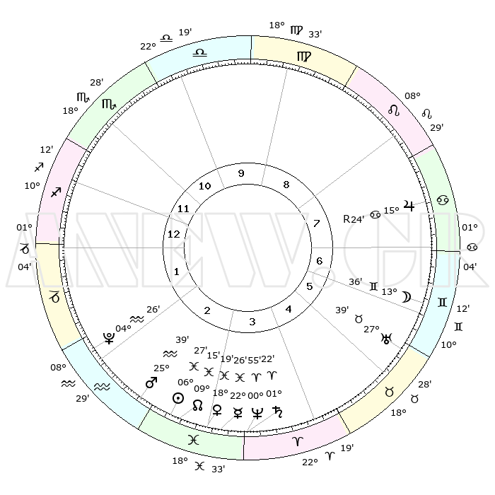 | | ΘΕΣΕΙΣ ΠΛΑΝΗΤΩΝ ΑΣΤΡΟΛΟΓΙΚΟΥ ΧΑΡΤΗ ΤΗΣ ΣΤΙΓΜΗΣ ΑΥΤΗΣ | | | | Πλανήτης | Ζώδιο | Μοίρες | Δεκαήμ. | Σε οίκο | Απόκλιση | | Ακμές των οίκων | | Ηλιος | Ιχθείς | 06°24' | Πρώτο | 3 | 09 S 10 | | 1ος | 15°36' | Τοξότης | | Σελήνη | Δίδυμοι | 12°54' | Δεύτερο | 6 | 27 N 34 | | 2ος | 19°24' | Αιγόκερως | | Ερμής | Ιχθείς | 22°26' | Τρίτο | 3 | 00 S 42 | | 3ος | 27°42' | Υδροχόος | | Αφροδίτη | Ιχθείς | 18°15' | Δεύτερο | 3 | 05 S 57 | | 4ος | 03°22' | Κριός | | Αρης | Υδροχόος | 25°37' | Τρίτο | 2 | 14 S 00 | | 5ος | 02°05' | Ταύρος | | Δίας | Καρκίνος | 15°25'R | Δεύτερο | 7 | 22 N 53 | | 6ος | 25°10' | Ταύρος | | Κρόνος | Κριός | 01°22' | Πρώτο | 3 | 01 S 25 | | 7ος | 15°36' | Δίδυμοι | | Ουρανός | Ταύρος | 27°39' | Τρίτο | 6 | 19 N 27 | | 8ος | 19°24' | Καρκίνος | | Ποσειδώνας | Κριός | 00°54' | Πρώτο | 3 | 00 S 50 | | 9ος | 27°42' | Λέων | | Πλούτωνας | Υδροχόος | 04°26' | Πρώτο | 2 | 22 S 54 | | 10ος | 03°22' | Ζυγός | | Β. Δεσμός | Ιχθείς | 09°15' | Πρώτο | 3 | 08 S 06 | | 11ος | 02°05' | Σκορπιός | | Ωροσκόπος | Τοξότης | 15°36' | Δεύτερο | | | 12ος | 25°10' | Σκορπιός | | Μεσουράνημα | Ζυγός | 03°22' | Πρώτο | | | |