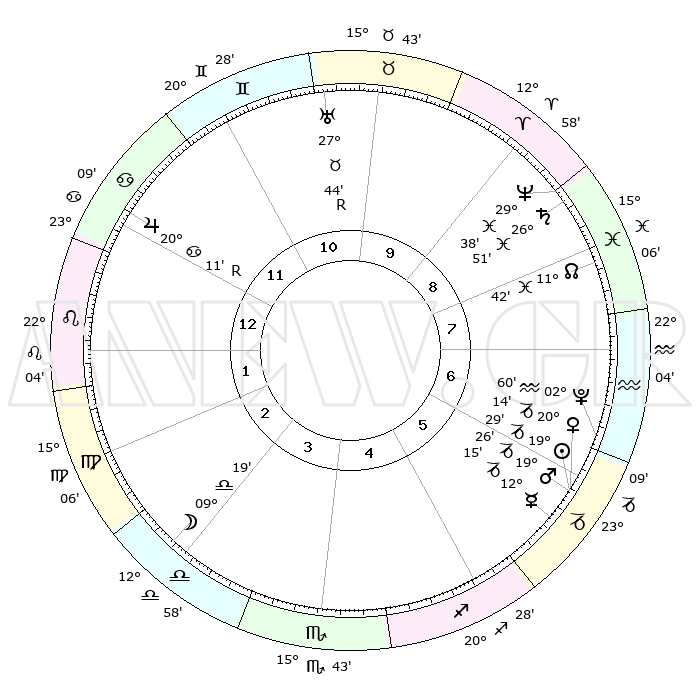 | | ΘΕΣΕΙΣ ΠΛΑΝΗΤΩΝ ΑΣΤΡΟΛΟΓΙΚΟΥ ΧΑΡΤΗ ΤΗΣ ΣΤΙΓΜΗΣ ΑΥΤΗΣ | | | | Πλανήτης | Ζώδιο | Μοίρες | Δεκαήμ. | Σε οίκο | Απόκλιση | | Ακμές των οίκων | | Ηλιος | Αιγόκερως | 18°45' | Δεύτερο | 3 | 22 S 07 | | 1ος | 11°46' | Σκορπιός | | Σελήνη | Ζυγός | 00°17' | Πρώτο | 11 | 01 S 43 | | 2ος | 10°58' | Τοξότης | | Ερμής | Αιγόκερως | 11°06' | Δεύτερο | 2 | 24 S 19 | | 3ος | 14°04' | Αιγόκερως | | Αφροδίτη | Αιγόκερως | 19°19' | Δεύτερο | 3 | 22 S 49 | | 4ος | 19°07' | Υδροχόος | | Αρης | Αιγόκερως | 18°52' | Δεύτερο | 3 | 23 S 02 | | 5ος | 21°42' | Ιχθείς | | Δίας | Καρκίνος | 20°17'R | Τρίτο | 9 | 22 N 09 | | 6ος | 19°08' | Κριός | | Κρόνος | Ιχθείς | 26°48' | Τρίτο | 5 | 03 S 19 | | 7ος | 11°46' | Ταύρος | | Ουρανός | Ταύρος | 27°45'R | Τρίτο | 7 | 19 N 28 | | 8ος | 10°58' | Δίδυμοι | | Ποσειδώνας | Ιχθείς | 29°38' | Τρίτο | 5 | 01 S 22 | | 9ος | 14°04' | Καρκίνος | | Πλούτωνας | Υδροχόος | 02°58' | Πρώτο | 3 | 23 S 10 | | 10ος | 19°07' | Λέων | | Β. Δεσμός | Ιχθείς | 11°45' | Δεύτερο | 4 | 07 S 09 | | 11ος | 21°42' | Παρθένος | | Ωροσκόπος | Σκορπιός | 11°46' | Δεύτερο | | | 12ος | 19°08' | Ζυγός | | Μεσουράνημα | Λέων | 19°07' | Δεύτερο | | | |