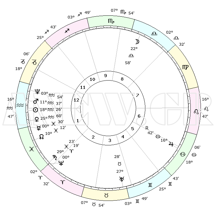 | | ΘΕΣΕΙΣ ΠΛΑΝΗΤΩΝ ΑΣΤΡΟΛΟΓΙΚΟΥ ΧΑΡΤΗ ΤΗΣ ΣΤΙΓΜΗΣ ΑΥΤΗΣ | | | | Πλανήτης | Ζώδιο | Μοίρες | Δεκαήμ. | Σε οίκο | Απόκλιση | | Ακμές των οίκων | | Ηλιος | Υδροχόος | 18°23' | Δεύτερο | 1 | 15 S 19 | | 1ος | 18°27' | Αιγόκερως | | Σελήνη | Ζυγός | 22°10' | Τρίτο | 9 | 11 S 57 | | 2ος | 00°13' | Ιχθείς | | Ερμής | Ιχθείς | 00°23' | Πρώτο | 2 | 12 S 34 | | 3ος | 10°06' | Κριός | | Αφροδίτη | Υδροχόος | 25°55' | Τρίτο | 1 | 14 S 14 | | 4ος | 10°40' | Ταύρος | | Αρης | Υδροχόος | 11°34' | Δεύτερο | 1 | 18 S 20 | | 5ος | 04°29' | Δίδυμοι | | Δίας | Καρκίνος | 16°43'R | Δεύτερο | 6 | 22 N 42 | | 6ος | 25°41' | Δίδυμοι | | Κρόνος | Ιχθείς | 29°23' | Τρίτο | 2 | 02 S 14 | | 7ος | 18°27' | Καρκίνος | | Ουρανός | Ταύρος | 27°28' | Τρίτο | 4 | 19 N 24 | | 8ος | 00°13' | Παρθένος | | Ποσειδώνας | Κριός | 00°19' | Πρώτο | 2 | 01 S 05 | | 9ος | 10°06' | Ζυγός | | Πλούτωνας | Υδροχόος | 03°54' | Πρώτο | 1 | 22 S 59 | | 10ος | 10°40' | Σκορπιός | | Β. Δεσμός | Ιχθείς | 10°12' | Δεύτερο | 2 | 07 S 44 | | 11ος | 04°29' | Τοξότης | | Ωροσκόπος | Αιγόκερως | 18°27' | Δεύτερο | | | 12ος | 25°41' | Τοξότης | | Μεσουράνημα | Σκορπιός | 10°40' | Δεύτερο | | | |