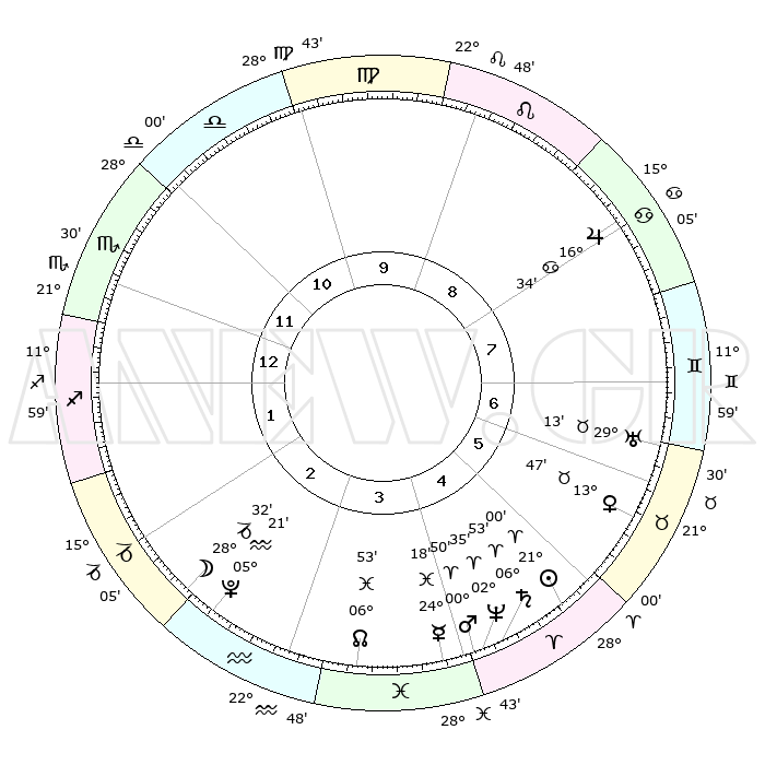 | | ΘΕΣΕΙΣ ΠΛΑΝΗΤΩΝ ΑΣΤΡΟΛΟΓΙΚΟΥ ΧΑΡΤΗ ΤΗΣ ΣΤΙΓΜΗΣ ΑΥΤΗΣ | | | | Πλανήτης | Ζώδιο | Μοίρες | Δεκαήμ. | Σε οίκο | Απόκλιση | | Ακμές των οίκων | | Ηλιος | Κριός | 20°39' | Τρίτο | 9 | 08 N 04 | | 1ος | 24°15' | Λέων | | Σελήνη | Αιγόκερως | 24°03' | Τρίτο | 5 | 24 S 50 | | 2ος | 17°30' | Παρθένος | | Ερμής | Ιχθείς | 23°50' | Τρίτο | 8 | 04 S 38 | | 3ος | 15°36' | Ζυγός | | Αφροδίτη | Ταύρος | 13°20' | Δεύτερο | 9 | 15 N 48 | | 4ος | 18°25' | Σκορπιός | | Αρης | Κριός | 00°33' | Πρώτο | 8 | 00 S 42 | | 5ος | 23°01' | Τοξότης | | Δίας | Καρκίνος | 16°32' | Δεύτερο | 11 | 22 N 47 | | 6ος | 25°28' | Αιγόκερως | | Κρόνος | Κριός | 06°50' | Πρώτο | 8 | 00 N 45 | | 7ος | 24°15' | Υδροχόος | | Ουρανός | Ταύρος | 29°12' | Τρίτο | 10 | 19 N 49 | | 8ος | 17°30' | Ιχθείς | | Ποσειδώνας | Κριός | 02°34' | Πρώτο | 8 | 00 S 11 | | 9ος | 15°36' | Κριός | | Πλούτωνας | Υδροχόος | 05°21' | Πρώτο | 6 | 22 S 47 | | 10ος | 18°25' | Ταύρος | | Β. Δεσμός | Ιχθείς | 06°54' | Πρώτο | 7 | 08 S 59 | | 11ος | 23°01' | Δίδυμοι | | Ωροσκόπος | Λέων | 24°15' | Τρίτο | | | 12ος | 25°28' | Καρκίνος | | Μεσουράνημα | Ταύρος | 18°25' | Δεύτερο | | | |