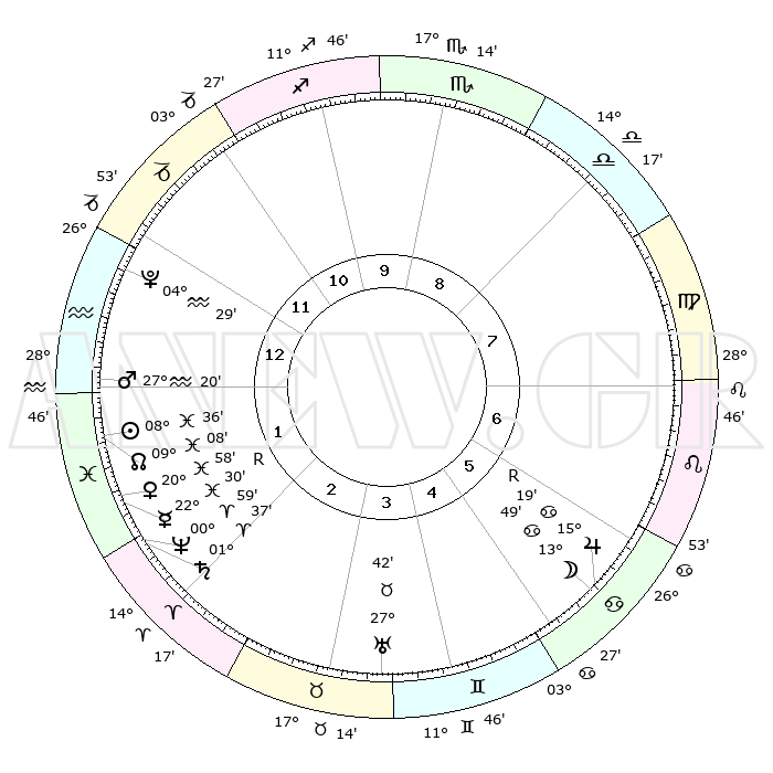 | | ΘΕΣΕΙΣ ΠΛΑΝΗΤΩΝ ΑΣΤΡΟΛΟΓΙΚΟΥ ΧΑΡΤΗ ΤΗΣ ΣΤΙΓΜΗΣ ΑΥΤΗΣ | | | | Πλανήτης | Ζώδιο | Μοίρες | Δεκαήμ. | Σε οίκο | Απόκλιση | | Ακμές των οίκων | | Ηλιος | Ιχθείς | 08°32' | Πρώτο | 1 | 08 S 22 | | 1ος | 26°03' | Αιγόκερως | | Σελήνη | Καρκίνος | 12°50' | Δεύτερο | 6 | 27 N 11 | | 2ος | 09°27' | Ιχθείς | | Ερμής | Ιχθείς | 22°30'R | Τρίτο | 2 | 00 S 15 | | 3ος | 18°29' | Κριός | | Αφροδίτη | Ιχθείς | 20°53' | Τρίτο | 2 | 04 S 53 | | 4ος | 17°38' | Ταύρος | | Αρης | Υδροχόος | 27°16' | Τρίτο | 1 | 13 S 27 | | 5ος | 10°43' | Δίδυμοι | | Δίας | Καρκίνος | 15°19'R | Δεύτερο | 6 | 22 N 54 | | 6ος | 02°01' | Καρκίνος | | Κρόνος | Κριός | 01°37' | Πρώτο | 2 | 01 S 19 | | 7ος | 26°03' | Καρκίνος | | Ουρανός | Ταύρος | 27°42' | Τρίτο | 4 | 19 N 28 | | 8ος | 09°27' | Παρθένος | | Ποσειδώνας | Κριός | 00°59' | Πρώτο | 2 | 00 S 49 | | 9ος | 18°29' | Ζυγός | | Πλούτωνας | Υδροχόος | 04°29' | Πρώτο | 1 | 22 S 53 | | 10ος | 17°38' | Σκορπιός | | Β. Δεσμός | Ιχθείς | 09°09' | Πρώτο | 1 | 08 S 08 | | 11ος | 10°43' | Τοξότης | | Ωροσκόπος | Αιγόκερως | 26°03' | Τρίτο | | | 12ος | 02°01' | Αιγόκερως | | Μεσουράνημα | Σκορπιός | 17°38' | Δεύτερο | | | |