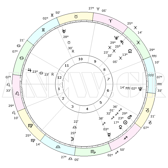 | | ΘΕΣΕΙΣ ΠΛΑΝΗΤΩΝ ΑΣΤΡΟΛΟΓΙΚΟΥ ΧΑΡΤΗ ΤΗΣ ΣΤΙΓΜΗΣ ΑΥΤΗΣ | | | | Πλανήτης | Ζώδιο | Μοίρες | Δεκαήμ. | Σε οίκο | Απόκλιση | | Ακμές των οίκων | | Ηλιος | Τοξότης | 22°43' | Τρίτο | 9 | 23 S 14 | | 1ος | 13°10' | Κριός | | Σελήνη | Ζυγός | 21°50' | Τρίτο | 7 | 11 S 26 | | 2ος | 20°03' | Ταύρος | | Ερμής | Τοξότης | 03°14' | Πρώτο | 8 | 19 S 13 | | 3ος | 15°35' | Δίδυμοι | | Αφροδίτη | Τοξότης | 17°10' | Δεύτερο | 9 | 22 S 38 | | 4ος | 07°26' | Καρκίνος | | Αρης | Τοξότης | 29°23' | Τρίτο | 9 | 24 S 12 | | 5ος | 00°28' | Λέων | | Δίας | Καρκίνος | 23°25'R | Τρίτο | 4 | 21 N 36 | | 6ος | 00°02' | Παρθένος | | Κρόνος | Ιχθείς | 25°31' | Τρίτο | 12 | 03 S 55 | | 7ος | 13°10' | Ζυγός | | Ουρανός | Ταύρος | 28°31'R | Τρίτο | 2 | 19 N 38 | | 8ος | 20°03' | Σκορπιός | | Ποσειδώνας | Ιχθείς | 29°23' | Τρίτο | 12 | 01 S 29 | | 9ος | 15°35' | Τοξότης | | Πλούτωνας | Υδροχόος | 02°14' | Πρώτο | 11 | 23 S 20 | | 10ος | 07°26' | Αιγόκερως | | Β. Δεσμός | Ιχθείς | 13°06' | Δεύτερο | 12 | 06 S 38 | | 11ος | 00°28' | Υδροχόος | | Ωροσκόπος | Κριός | 13°10' | Δεύτερο | | | 12ος | 00°02' | Ιχθείς | | Μεσουράνημα | Αιγόκερως | 07°26' | Πρώτο | | | |