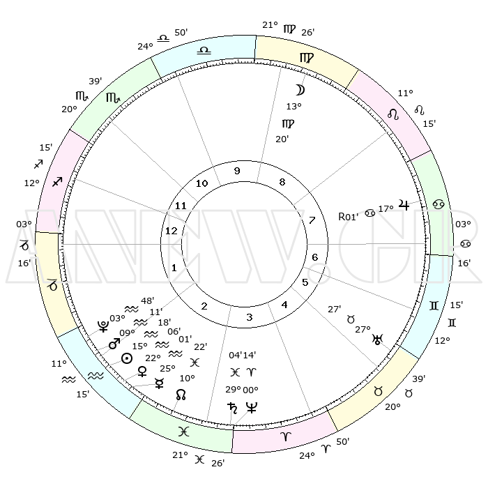 | | ΘΕΣΕΙΣ ΠΛΑΝΗΤΩΝ ΑΣΤΡΟΛΟΓΙΚΟΥ ΧΑΡΤΗ ΤΗΣ ΣΤΙΓΜΗΣ ΑΥΤΗΣ | | | | Πλανήτης | Ζώδιο | Μοίρες | Δεκαήμ. | Σε οίκο | Απόκλιση | | Ακμές των οίκων | | Ηλιος | Υδροχόος | 15°47' | Δεύτερο | 7 | 16 S 06 | | 1ος | 27°43' | Καρκίνος | | Σελήνη | Παρθένος | 19°34' | Δεύτερο | 3 | 03 N 15 | | 2ος | 18°37' | Λέων | | Ερμής | Υδροχόος | 25°51' | Τρίτο | 8 | 14 S 24 | | 3ος | 13°21' | Παρθένος | | Αφροδίτη | Υδροχόος | 22°42' | Τρίτο | 8 | 15 S 17 | | 4ος | 14°06' | Ζυγός | | Αρης | Υδροχόος | 09°33' | Πρώτο | 7 | 18 S 52 | | 5ος | 20°11' | Σκορπιός | | Δίας | Καρκίνος | 16°58'R | Δεύτερο | 12 | 22 N 40 | | 6ος | 26°16' | Τοξότης | | Κρόνος | Ιχθείς | 29°07' | Τρίτο | 9 | 02 S 20 | | 7ος | 27°43' | Αιγόκερως | | Ουρανός | Ταύρος | 27°27' | Τρίτο | 11 | 19 N 24 | | 8ος | 18°37' | Υδροχόος | | Ποσειδώνας | Κριός | 00°15' | Πρώτο | 9 | 01 S 06 | | 9ος | 13°21' | Ιχθείς | | Πλούτωνας | Υδροχόος | 03°49' | Πρώτο | 7 | 23 S 00 | | 10ος | 14°06' | Κριός | | Β. Δεσμός | Ιχθείς | 10°20' | Δεύτερο | 8 | 07 S 41 | | 11ος | 20°11' | Ταύρος | | Ωροσκόπος | Καρκίνος | 27°43' | Τρίτο | | | 12ος | 26°16' | Δίδυμοι | | Μεσουράνημα | Κριός | 14°06' | Δεύτερο | | | |