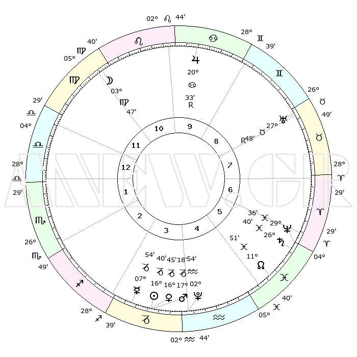 | | ΘΕΣΕΙΣ ΠΛΑΝΗΤΩΝ ΑΣΤΡΟΛΟΓΙΚΟΥ ΧΑΡΤΗ ΤΗΣ ΣΤΙΓΜΗΣ ΑΥΤΗΣ | | | | Πλανήτης | Ζώδιο | Μοίρες | Δεκαήμ. | Σε οίκο | Απόκλιση | | Ακμές των οίκων | | Ηλιος | Αιγόκερως | 15°02' | Δεύτερο | 10 | 22 S 35 | | 1ος | 22°09' | Ιχθείς | | Σελήνη | Λέων | 11°35' | Δεύτερο | 5 | 19 N 40 | | 2ος | 04°14' | Ταύρος | | Ερμής | Αιγόκερως | 05°24' | Πρώτο | 10 | 24 S 21 | | 3ος | 02°53' | Δίδυμοι | | Αφροδίτη | Αιγόκερως | 14°44' | Δεύτερο | 10 | 23 S 17 | | 4ος | 25°35' | Δίδυμοι | | Αρης | Αιγόκερως | 16°04' | Δεύτερο | 10 | 23 S 23 | | 5ος | 17°35' | Καρκίνος | | Δίας | Καρκίνος | 20°46'R | Τρίτο | 5 | 22 N 04 | | 6ος | 13°50' | Λέων | | Κρόνος | Ιχθείς | 26°33' | Τρίτο | 1 | 03 S 26 | | 7ος | 22°09' | Παρθένος | | Ουρανός | Ταύρος | 27°50'R | Τρίτο | 2 | 19 N 29 | | 8ος | 04°14' | Σκορπιός | | Ποσειδώνας | Ιχθείς | 29°34' | Τρίτο | 1 | 01 S 24 | | 9ος | 02°53' | Τοξότης | | Πλούτωνας | Υδροχόος | 02°51' | Πρώτο | 11 | 23 S 11 | | 10ος | 25°35' | Τοξότης | | Β. Δεσμός | Ιχθείς | 11°56' | Δεύτερο | 12 | 07 S 05 | | 11ος | 17°35' | Αιγόκερως | | Ωροσκόπος | Ιχθείς | 22°09' | Τρίτο | | | 12ος | 13°50' | Υδροχόος | | Μεσουράνημα | Τοξότης | 25°35' | Τρίτο | | | |