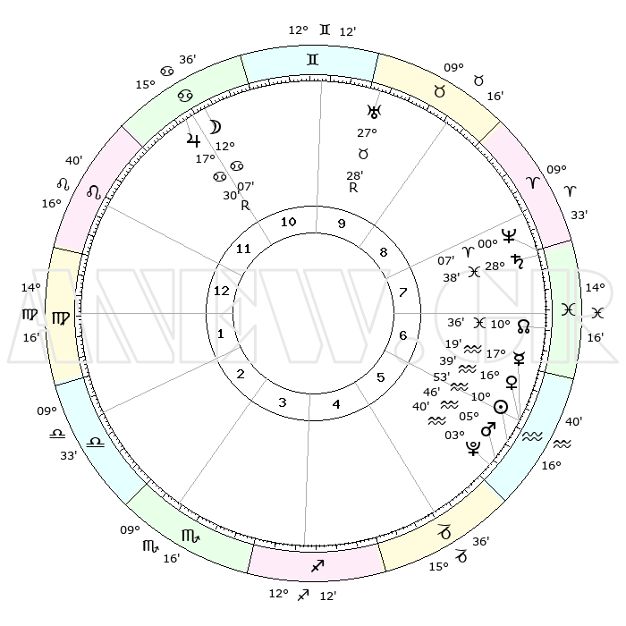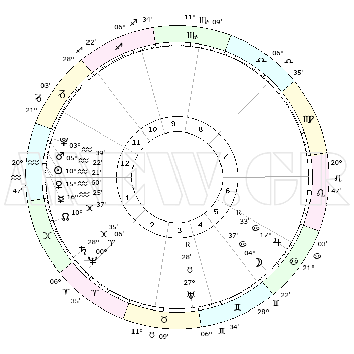 | | ΘΕΣΕΙΣ ΠΛΑΝΗΤΩΝ ΑΣΤΡΟΛΟΓΙΚΟΥ ΧΑΡΤΗ ΤΗΣ ΣΤΙΓΜΗΣ ΑΥΤΗΣ | | | | Πλανήτης | Ζώδιο | Μοίρες | Δεκαήμ. | Σε οίκο | Απόκλιση | | Ακμές των οίκων | | Ηλιος | Υδροχόος | 10°49' | Δεύτερο | 6 | 17 S 31 | | 1ος | 25°24' | Λέων | | Σελήνη | Καρκίνος | 11°11' | Δεύτερο | 11 | 27 N 22 | | 2ος | 18°47' | Παρθένος | | Ερμής | Υδροχόος | 17°12' | Δεύτερο | 6 | 17 S 32 | | 3ος | 17°00' | Ζυγός | | Αφροδίτη | Υδροχόος | 16°34' | Δεύτερο | 6 | 17 S 09 | | 4ος | 19°51' | Σκορπιός | | Αρης | Υδροχόος | 05°44' | Πρώτο | 6 | 19 S 50 | | 5ος | 24°22' | Τοξότης | | Δίας | Καρκίνος | 17°30'R | Δεύτερο | 11 | 22 N 35 | | 6ος | 26°42' | Αιγόκερως | | Κρόνος | Ιχθείς | 28°38' | Τρίτο | 8 | 02 S 33 | | 7ος | 25°24' | Υδροχόος | | Ουρανός | Ταύρος | 27°28'R | Τρίτο | 10 | 19 N 24 | | 8ος | 18°47' | Ιχθείς | | Ποσειδώνας | Κριός | 00°06' | Πρώτο | 8 | 01 S 10 | | 9ος | 17°00' | Κριός | | Πλούτωνας | Υδροχόος | 03°40' | Πρώτο | 6 | 23 S 02 | | 10ος | 19°51' | Ταύρος | | Β. Δεσμός | Ιχθείς | 10°36' | Δεύτερο | 7 | 07 S 36 | | 11ος | 24°22' | Δίδυμοι | | Ωροσκόπος | Λέων | 25°24' | Τρίτο | | | 12ος | 26°42' | Καρκίνος | | Μεσουράνημα | Ταύρος | 19°51' | Δεύτερο | | | |