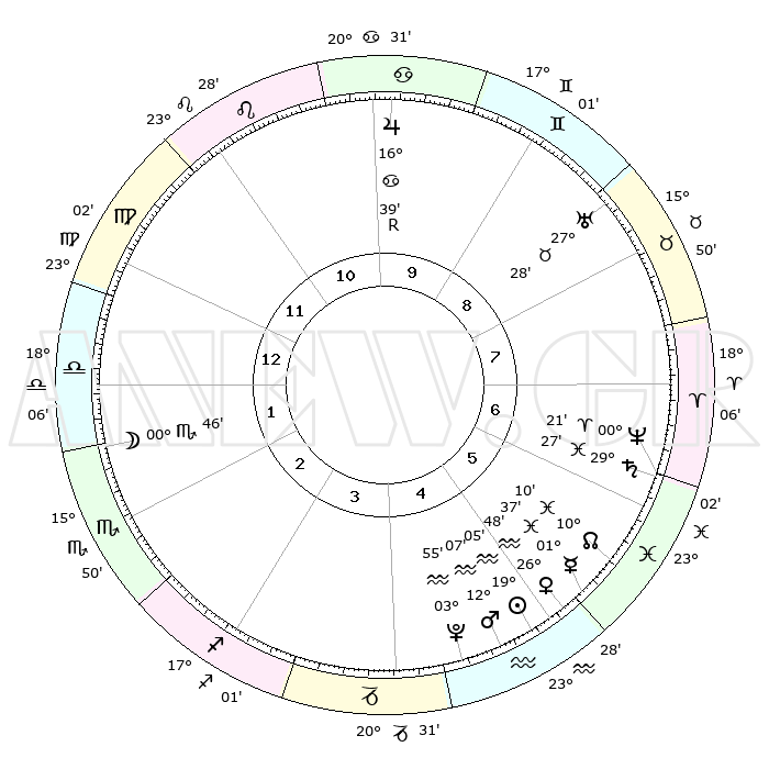 | | ΘΕΣΕΙΣ ΠΛΑΝΗΤΩΝ ΑΣΤΡΟΛΟΓΙΚΟΥ ΧΑΡΤΗ ΤΗΣ ΣΤΙΓΜΗΣ ΑΥΤΗΣ | | | | Πλανήτης | Ζώδιο | Μοίρες | Δεκαήμ. | Σε οίκο | Απόκλιση | | Ακμές των οίκων | | Ηλιος | Υδροχόος | 19°01' | Δεύτερο | 5 | 15 S 07 | | 1ος | 26°13' | Παρθένος | | Σελήνη | Ζυγός | 29°52' | Τρίτο | 2 | 15 S 13 | | 2ος | 22°31' | Ζυγός | | Ερμής | Ιχθείς | 01°29' | Πρώτο | 6 | 12 S 06 | | 3ος | 22°48' | Σκορπιός | | Αφροδίτη | Υδροχόος | 26°42' | Τρίτο | 5 | 13 S 58 | | 4ος | 25°45' | Τοξότης | | Αρης | Υδροχόος | 12°04' | Δεύτερο | 5 | 18 S 12 | | 5ος | 28°47' | Αιγόκερως | | Δίας | Καρκίνος | 16°39'R | Δεύτερο | 10 | 22 N 43 | | 6ος | 29°22' | Υδροχόος | | Κρόνος | Ιχθείς | 29°27' | Τρίτο | 7 | 02 S 12 | | 7ος | 26°13' | Ιχθείς | | Ουρανός | Ταύρος | 27°28' | Τρίτο | 9 | 19 N 24 | | 8ος | 22°31' | Κριός | | Ποσειδώνας | Κριός | 00°20' | Πρώτο | 7 | 01 S 04 | | 9ος | 22°48' | Ταύρος | | Πλούτωνας | Υδροχόος | 03°55' | Πρώτο | 5 | 22 S 59 | | 10ος | 25°45' | Δίδυμοι | | Β. Δεσμός | Ιχθείς | 10°10' | Δεύτερο | 6 | 07 S 45 | | 11ος | 28°47' | Καρκίνος | | Ωροσκόπος | Παρθένος | 26°13' | Τρίτο | | | 12ος | 29°22' | Λέων | | Μεσουράνημα | Δίδυμοι | 25°45' | Τρίτο | | | |