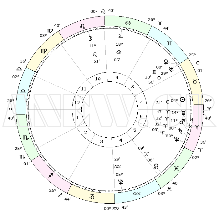 | | ΘΕΣΕΙΣ ΠΛΑΝΗΤΩΝ ΑΣΤΡΟΛΟΓΙΚΟΥ ΧΑΡΤΗ ΤΗΣ ΣΤΙΓΜΗΣ ΑΥΤΗΣ | | | | Πλανήτης | Ζώδιο | Μοίρες | Δεκαήμ. | Σε οίκο | Απόκλιση | | Ακμές των οίκων | | Ηλιος | Ταύρος | 04°27' | Πρώτο | 7 | 13 N 00 | | 1ος | 11°20' | Ζυγός | | Σελήνη | Λέων | 11°08' | Δεύτερο | 10 | 19 N 36 | | 2ος | 08°40' | Σκορπιός | | Ερμής | Κριός | 14°41' | Δεύτερο | 7 | 03 N 31 | | 3ος | 09°32' | Τοξότης | | Αφροδίτη | Δίδυμοι | 00°34' | Πρώτο | 8 | 20 N 52 | | 4ος | 12°46' | Αιγόκερως | | Αρης | Κριός | 11°29' | Δεύτερο | 7 | 03 N 41 | | 5ος | 15°42' | Υδροχόος | | Δίας | Καρκίνος | 18°04' | Δεύτερο | 10 | 22 N 36 | | 6ος | 15°39' | Ιχθείς | | Κρόνος | Κριός | 08°32' | Πρώτο | 6 | 01 N 24 | | 7ος | 11°20' | Κριός | | Ουρανός | Ταύρος | 29°56' | Τρίτο | 8 | 19 N 58 | | 8ος | 08°40' | Ταύρος | | Ποσειδώνας | Κριός | 03°03' | Πρώτο | 6 | 00 N 00 | | 9ος | 09°32' | Δίδυμοι | | Πλούτωνας | Υδροχόος | 05°29' | Πρώτο | 4 | 22 S 48 | | 10ος | 12°46' | Καρκίνος | | Β. Δεσμός | Ιχθείς | 06°09' | Πρώτο | 5 | 09 S 15 | | 11ος | 15°42' | Λέων | | Ωροσκόπος | Ζυγός | 11°20' | Δεύτερο | | | 12ος | 15°39' | Παρθένος | | Μεσουράνημα | Καρκίνος | 12°46' | Δεύτερο | | | |