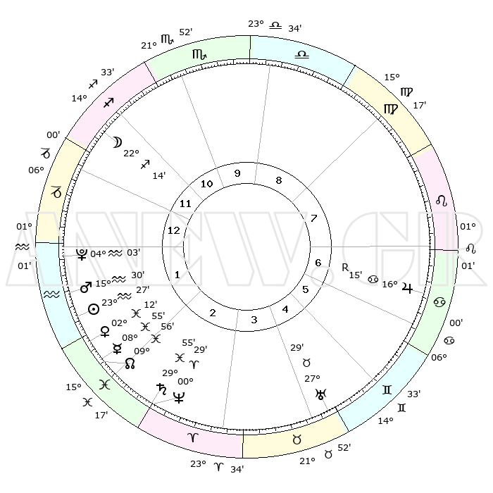| | ΘΕΣΕΙΣ ΠΛΑΝΗΤΩΝ ΑΣΤΡΟΛΟΓΙΚΟΥ ΧΑΡΤΗ ΤΗΣ ΣΤΙΓΜΗΣ ΑΥΤΗΣ | | | | Πλανήτης | Ζώδιο | Μοίρες | Δεκαήμ. | Σε οίκο | Απόκλιση | | Ακμές των οίκων | | Ηλιος | Υδροχόος | 23°19' | Τρίτο | 2 | 13 S 45 | | 1ος | 12°49' | Τοξότης | | Σελήνη | Τοξότης | 20°36' | Τρίτο | 1 | 28 S 14 | | 2ος | 16°04' | Αιγόκερως | | Ερμής | Ιχθείς | 08°41' | Πρώτο | 3 | 08 S 49 | | 3ος | 23°56' | Υδροχόος | | Αφροδίτη | Ιχθείς | 02°02' | Πρώτο | 3 | 12 S 07 | | 4ος | 29°47' | Ιχθείς | | Αρης | Υδροχόος | 15°24' | Δεύτερο | 2 | 17 S 14 | | 5ος | 28°57' | Κριός | | Δίας | Καρκίνος | 16°16'R | Δεύτερο | 8 | 22 N 46 | | 6ος | 22°21' | Ταύρος | | Κρόνος | Ιχθείς | 29°54' | Τρίτο | 4 | 02 S 01 | | 7ος | 12°49' | Δίδυμοι | | Ουρανός | Ταύρος | 27°29' | Τρίτο | 6 | 19 N 25 | | 8ος | 16°05' | Καρκίνος | | Ποσειδώνας | Κριός | 00°28' | Πρώτο | 4 | 01 S 01 | | 9ος | 23°56' | Λέων | | Πλούτωνας | Υδροχόος | 04°03' | Πρώτο | 2 | 22 S 57 | | 10ος | 29°47' | Παρθένος | | Β. Δεσμός | Ιχθείς | 09°57' | Πρώτο | 3 | 07 S 50 | | 11ος | 28°57' | Ζυγός | | Ωροσκόπος | Τοξότης | 12°49' | Δεύτερο | | | 12ος | 22°21' | Σκορπιός | | Μεσουράνημα | Παρθένος | 29°47' | Τρίτο | | | |