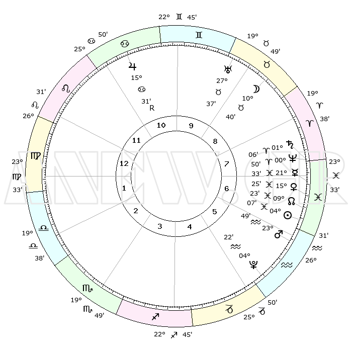 | | ΘΕΣΕΙΣ ΠΛΑΝΗΤΩΝ ΑΣΤΡΟΛΟΓΙΚΟΥ ΧΑΡΤΗ ΤΗΣ ΣΤΙΓΜΗΣ ΑΥΤΗΣ | | | | Πλανήτης | Ζώδιο | Μοίρες | Δεκαήμ. | Σε οίκο | Απόκλιση | | Ακμές των οίκων | | Ηλιος | Ιχθείς | 04°02' | Πρώτο | 7 | 10 S 02 | | 1ος | 29°08' | Λέων | | Σελήνη | Ταύρος | 09°30' | Πρώτο | 9 | 19 N 01 | | 2ος | 22°53' | Παρθένος | | Ερμής | Ιχθείς | 21°30' | Τρίτο | 7 | 01 S 36 | | 3ος | 21°29' | Ζυγός | | Αφροδίτη | Ιχθείς | 15°18' | Δεύτερο | 7 | 07 S 07 | | 4ος | 24°23' | Σκορπιός | | Αρης | Υδροχόος | 23°45' | Τρίτο | 6 | 14 S 38 | | 5ος | 28°38' | Τοξότης | | Δίας | Καρκίνος | 15°32'R | Δεύτερο | 11 | 22 N 52 | | 6ος | 00°40' | Υδροχόος | | Κρόνος | Κριός | 01°06' | Πρώτο | 8 | 01 S 32 | | 7ος | 29°08' | Υδροχόος | | Ουρανός | Ταύρος | 27°37' | Τρίτο | 10 | 19 N 27 | | 8ος | 22°53' | Ιχθείς | | Ποσειδώνας | Κριός | 00°50' | Πρώτο | 8 | 00 S 52 | | 9ος | 21°29' | Κριός | | Πλούτωνας | Υδροχόος | 04°22' | Πρώτο | 6 | 22 S 54 | | 10ος | 24°23' | Ταύρος | | Β. Δεσμός | Ιχθείς | 09°23' | Πρώτο | 7 | 08 S 03 | | 11ος | 28°38' | Δίδυμοι | | Ωροσκόπος | Λέων | 29°08' | Τρίτο | | | 12ος | 00°40' | Λέων | | Μεσουράνημα | Ταύρος | 24°23' | Τρίτο | | | |