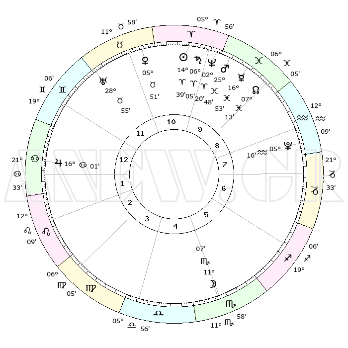 | | ΘΕΣΕΙΣ ΠΛΑΝΗΤΩΝ ΑΣΤΡΟΛΟΓΙΚΟΥ ΧΑΡΤΗ ΤΗΣ ΣΤΙΓΜΗΣ ΑΥΤΗΣ | | | | Πλανήτης | Ζώδιο | Μοίρες | Δεκαήμ. | Σε οίκο | Απόκλιση | | Ακμές των οίκων | | Ηλιος | Κριός | 14°35' | Δεύτερο | 10 | 05 N 45 | | 1ος | 03°04' | Καρκίνος | | Σελήνη | Σκορπιός | 10°23' | Δεύτερο | 5 | 19 S 15 | | 2ος | 23°42' | Καρκίνος | | Ερμής | Ιχθείς | 16°49' | Δεύτερο | 10 | 06 S 50 | | 3ος | 15°43' | Λέων | | Αφροδίτη | Ταύρος | 05°47' | Πρώτο | 11 | 13 N 10 | | 4ος | 12°31' | Παρθένος | | Αρης | Ιχθείς | 25°45' | Τρίτο | 10 | 02 S 38 | | 5ος | 16°56' | Ζυγός | | Δίας | Καρκίνος | 16°01' | Δεύτερο | 1 | 22 N 51 | | 6ος | 26°41' | Σκορπιός | | Κρόνος | Κριός | 06°05' | Πρώτο | 10 | 00 N 27 | | 7ος | 03°04' | Αιγόκερως | | Ουρανός | Ταύρος | 28°55' | Τρίτο | 12 | 19 N 45 | | 8ος | 23°42' | Αιγόκερως | | Ποσειδώνας | Κριός | 02°20' | Πρώτο | 10 | 00 S 16 | | 9ος | 15°43' | Υδροχόος | | Πλούτωνας | Υδροχόος | 05°16' | Πρώτο | 8 | 22 S 47 | | 10ος | 12°31' | Ιχθείς | | Β. Δεσμός | Ιχθείς | 07°14' | Πρώτο | 9 | 08 S 51 | | 11ος | 16°56' | Κριός | | Ωροσκόπος | Καρκίνος | 03°04' | Πρώτο | | | 12ος | 26°41' | Ταύρος | | Μεσουράνημα | Ιχθείς | 12°31' | Δεύτερο | | | |