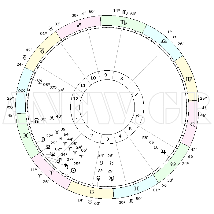 | | ΘΕΣΕΙΣ ΠΛΑΝΗΤΩΝ ΑΣΤΡΟΛΟΓΙΚΟΥ ΧΑΡΤΗ ΤΗΣ ΣΤΙΓΜΗΣ ΑΥΤΗΣ | | | | Πλανήτης | Ζώδιο | Μοίρες | Δεκαήμ. | Σε οίκο | Απόκλιση | | Ακμές των οίκων | | Ηλιος | Κριός | 25°03' | Τρίτο | 3 | 09 N 42 | | 1ος | 28°18' | Αιγόκερως | | Σελήνη | Ιχθείς | 21°51' | Τρίτο | 2 | 02 S 07 | | 2ος | 12°07' | Ιχθείς | | Ερμής | Ιχθείς | 29°49' | Τρίτο | 2 | 02 S 27 | | 3ος | 20°49' | Κριός | | Αφροδίτη | Ταύρος | 18°50' | Δεύτερο | 3 | 17 N 35 | | 4ος | 19°35' | Ταύρος | | Αρης | Κριός | 04°02' | Πρώτο | 2 | 00 N 42 | | 5ος | 12°28' | Δίδυμοι | | Δίας | Καρκίνος | 16°58' | Δεύτερο | 6 | 22 N 44 | | 6ος | 03°50' | Καρκίνος | | Κρόνος | Κριός | 07°23' | Πρώτο | 2 | 00 N 58 | | 7ος | 28°18' | Καρκίνος | | Ουρανός | Ταύρος | 29°25' | Τρίτο | 4 | 19 N 51 | | 8ος | 12°07' | Παρθένος | | Ποσειδώνας | Κριός | 02°43' | Πρώτο | 2 | 00 S 07 | | 9ος | 20°49' | Ζυγός | | Πλούτωνας | Υδροχόος | 05°24' | Πρώτο | 1 | 22 S 47 | | 10ος | 19°35' | Σκορπιός | | Β. Δεσμός | Ιχθείς | 06°40' | Πρώτο | 1 | 09 S 04 | | 11ος | 12°28' | Τοξότης | | Ωροσκόπος | Αιγόκερως | 28°18' | Τρίτο | | | 12ος | 03°50' | Αιγόκερως | | Μεσουράνημα | Σκορπιός | 19°35' | Δεύτερο | | | |
