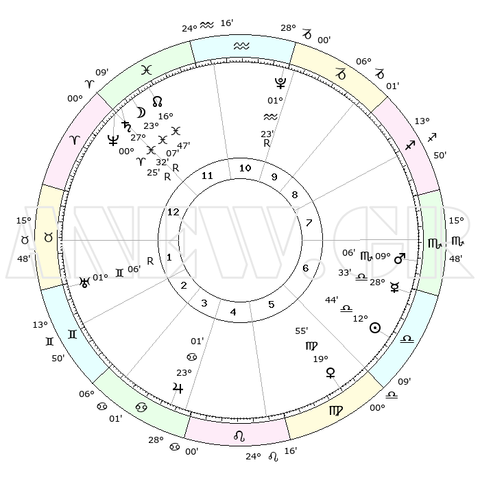 | ΘΕΣΕΙΣ ΠΛΑΝΗΤΩΝ ΑΣΤΡΟΛΟΓΙΚΟΥ ΧΑΡΤΗ ΤΗΣ ΣΤΙΓΜΗΣ ΑΥΤΗΣ | | Πλανήτης | Ζώδιο | Μοίρες | Δεκαήμ. | Σε οίκο | Απόκλιση | | Ακμές των οίκων | Ηλιος | Ζυγός | 12°38' | Δεύτερο | 7 | 04 S 59 | | 1ος | 23°29' | Ιχθείς | Σελήνη | Ιχθείς | 21°45' | Τρίτο | 12 | 02 S 59 | | 2ος | 05°16' | Ταύρος | Ερμής | Ζυγός | 28°24' | Τρίτο | 7 | 11 S 31 | | 3ος | 03°43' | Δίδυμοι | Αφροδίτη | Παρθένος | 19°48' | Δεύτερο | 6 | 05 N 19 | | 4ος | 26°20' | Δίδυμοι | Αρης | Σκορπιός | 09°02' | Πρώτο | 8 | 14 S 38 | | 5ος | 18°23' | Καρκίνος | Δίας | Καρκίνος | 23°00' | Τρίτο | 5 | 21 N 30 | | 6ος | 14°50' | Λέων | Κρόνος | Ιχθείς | 27°33'R | Τρίτο | 1 | 03 S 17 | | 7ος | 23°29' | Παρθένος | Ουρανός | Δίδυμοι | 01°06'R | Πρώτο | 2 | 20 N 10 | | 8ος | 05°16' | Σκορπιός | Ποσειδώνας | Κριός | 00°25'R | Πρώτο | 1 | 01 S 06 | | 9ος | 03°43' | Τοξότης | Πλούτωνας | Υδροχόος | 01°23'R | Πρώτο | 11 | 23 S 32 | | 10ος | 26°20' | Τοξότης | Β. Δεσμός | Ιχθείς | 16°48' | Δεύτερο | 12 | 05 S 13 | | 11ος | 18°23' | Αιγόκερως | Ωροσκόπος | Ιχθείς | 23°29' | Τρίτο | | | 12ος | 14°50' | Υδροχόος | Μεσουράνημα | Τοξότης | 26°20' | Τρίτο | | | |