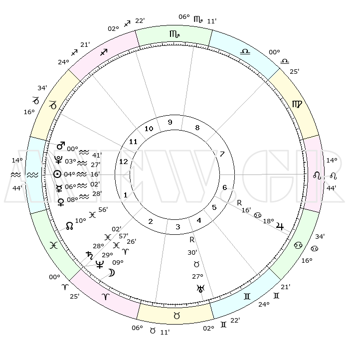 | | ΘΕΣΕΙΣ ΠΛΑΝΗΤΩΝ ΑΣΤΡΟΛΟΓΙΚΟΥ ΧΑΡΤΗ ΤΗΣ ΣΤΙΓΜΗΣ ΑΥΤΗΣ | | | | Πλανήτης | Ζώδιο | Μοίρες | Δεκαήμ. | Σε οίκο | Απόκλιση | | Ακμές των οίκων | | Ηλιος | Υδροχόος | 04°11' | Πρώτο | 1 | 19 S 12 | | 1ος | 15°01' | Αιγόκερως | | Σελήνη | Κριός | 08°29' | Πρώτο | 3 | 05 N 42 | | 2ος | 25°59' | Υδροχόος | | Ερμής | Υδροχόος | 05°55' | Πρώτο | 1 | 20 S 49 | | 3ος | 06°06' | Κριός | | Αφροδίτη | Υδροχόος | 08°23' | Πρώτο | 1 | 19 S 20 | | 4ος | 07°20' | Ταύρος | | Αρης | Υδροχόος | 00°38' | Πρώτο | 1 | 21 S 00 | | 5ος | 01°32' | Δίδυμοι | | Δίας | Καρκίνος | 18°17'R | Δεύτερο | 7 | 22 N 28 | | 6ος | 22°45' | Δίδυμοι | | Κρόνος | Ιχθείς | 28°01' | Τρίτο | 2 | 02 S 48 | | 7ος | 15°01' | Καρκίνος | | Ουρανός | Ταύρος | 27°30'R | Τρίτο | 4 | 19 N 25 | | 8ος | 25°59' | Λέων | | Ποσειδώνας | Ιχθείς | 29°56' | Τρίτο | 2 | 01 S 14 | | 9ος | 06°06' | Ζυγός | | Πλούτωνας | Υδροχόος | 03°27' | Πρώτο | 1 | 23 S 04 | | 10ος | 07°20' | Σκορπιός | | Β. Δεσμός | Ιχθείς | 10°56' | Δεύτερο | 2 | 07 S 28 | | 11ος | 01°32' | Τοξότης | | Ωροσκόπος | Αιγόκερως | 15°01' | Δεύτερο | | | 12ος | 22°45' | Τοξότης | | Μεσουράνημα | Σκορπιός | 07°20' | Πρώτο | | | |