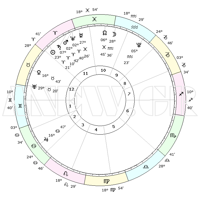 | | ΘΕΣΕΙΣ ΠΛΑΝΗΤΩΝ ΑΣΤΡΟΛΟΓΙΚΟΥ ΧΑΡΤΗ ΤΗΣ ΣΤΙΓΜΗΣ ΑΥΤΗΣ | | | | Πλανήτης | Ζώδιο | Μοίρες | Δεκαήμ. | Σε οίκο | Απόκλιση | | Ακμές των οίκων | | Ηλιος | Κριός | 23°17' | Τρίτο | 12 | 09 N 03 | | 1ος | 09°39' | Ταύρος | | Σελήνη | Υδροχόος | 27°41' | Τρίτο | 11 | 13 S 09 | | 2ος | 09°16' | Δίδυμοι | | Ερμής | Ιχθείς | 27°20' | Τρίτο | 12 | 03 S 23 | | 3ος | 01°55' | Καρκίνος | | Αφροδίτη | Ταύρος | 16°37' | Δεύτερο | 1 | 16 N 53 | | 4ος | 23°44' | Καρκίνος | | Αρης | Κριός | 02°38' | Πρώτο | 12 | 00 N 08 | | 5ος | 19°12' | Λέων | | Δίας | Καρκίνος | 16°47' | Δεύτερο | 3 | 22 N 45 | | 6ος | 23°50' | Παρθένος | | Κρόνος | Κριός | 07°10' | Πρώτο | 12 | 00 N 53 | | 7ος | 09°39' | Σκορπιός | | Ουρανός | Ταύρος | 29°20' | Τρίτο | 1 | 19 N 50 | | 8ος | 09°16' | Τοξότης | | Ποσειδώνας | Κριός | 02°40' | Πρώτο | 12 | 00 S 09 | | 9ος | 01°55' | Αιγόκερως | | Πλούτωνας | Υδροχόος | 05°23' | Πρώτο | 10 | 22 S 47 | | 10ος | 23°44' | Αιγόκερως | | Β. Δεσμός | Ιχθείς | 06°45' | Πρώτο | 11 | 09 S 02 | | 11ος | 19°12' | Υδροχόος | | Ωροσκόπος | Ταύρος | 09°39' | Πρώτο | | | 12ος | 23°50' | Ιχθείς | | Μεσουράνημα | Αιγόκερως | 23°44' | Τρίτο | | | |