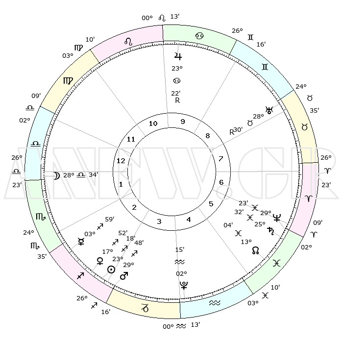 | | ΘΕΣΕΙΣ ΠΛΑΝΗΤΩΝ ΑΣΤΡΟΛΟΓΙΚΟΥ ΧΑΡΤΗ ΤΗΣ ΣΤΙΓΜΗΣ ΑΥΤΗΣ | | | | Πλανήτης | Ζώδιο | Μοίρες | Δεκαήμ. | Σε οίκο | Απόκλιση | | Ακμές των οίκων | | Ηλιος | Τοξότης | 22°53' | Τρίτο | 6 | 23 S 14 | | 1ος | 23°54' | Δίδυμοι | | Σελήνη | Ζυγός | 23°41' | Τρίτο | 5 | 12 S 14 | | 2ος | 15°09' | Καρκίνος | | Ερμής | Τοξότης | 03°27' | Πρώτο | 6 | 19 S 17 | | 3ος | 06°37' | Λέων | | Αφροδίτη | Τοξότης | 17°21' | Δεύτερο | 6 | 22 S 39 | | 4ος | 02°00' | Παρθένος | | Αρης | Τοξότης | 29°30' | Τρίτο | 7 | 24 S 12 | | 5ος | 04°54' | Ζυγός | | Δίας | Καρκίνος | 23°24'R | Τρίτο | 2 | 21 N 36 | | 6ος | 15°11' | Σκορπιός | | Κρόνος | Ιχθείς | 25°31' | Τρίτο | 10 | 03 S 55 | | 7ος | 23°54' | Τοξότης | | Ουρανός | Ταύρος | 28°31'R | Τρίτο | 12 | 19 N 38 | | 8ος | 15°09' | Αιγόκερως | | Ποσειδώνας | Ιχθείς | 29°23' | Τρίτο | 10 | 01 S 29 | | 9ος | 06°37' | Υδροχόος | | Πλούτωνας | Υδροχόος | 02°14' | Πρώτο | 8 | 23 S 20 | | 10ος | 02°00' | Ιχθείς | | Β. Δεσμός | Ιχθείς | 13°05' | Δεύτερο | 10 | 06 S 39 | | 11ος | 04°54' | Κριός | | Ωροσκόπος | Δίδυμοι | 23°54' | Τρίτο | | | 12ος | 15°11' | Ταύρος | | Μεσουράνημα | Ιχθείς | 02°00' | Πρώτο | | | |