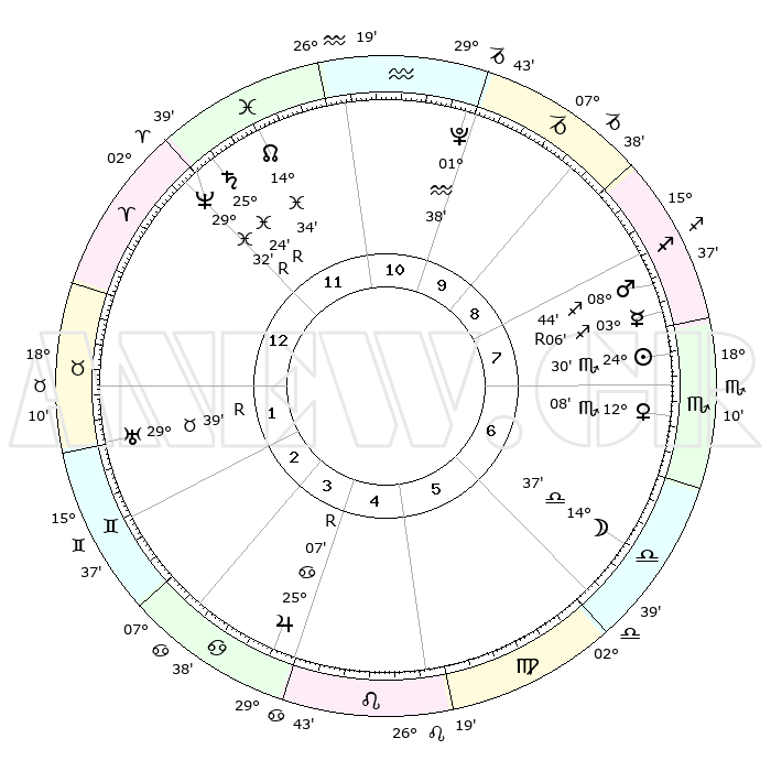 | | ΘΕΣΕΙΣ ΠΛΑΝΗΤΩΝ ΑΣΤΡΟΛΟΓΙΚΟΥ ΧΑΡΤΗ ΤΗΣ ΣΤΙΓΜΗΣ ΑΥΤΗΣ | | | | Πλανήτης | Ζώδιο | Μοίρες | Δεκαήμ. | Σε οίκο | Απόκλιση | | Ακμές των οίκων | | Ηλιος | Σκορπιός | 23°48' | Τρίτο | 4 | 18 S 43 | | 1ος | 28°16' | Λέων | | Σελήνη | Ζυγός | 06°15' | Πρώτο | 2 | 04 S 05 | | 2ος | 21°56' | Παρθένος | | Ερμής | Τοξότης | 03°50'R | Πρώτο | 4 | 21 S 50 | | 3ος | 20°27' | Ζυγός | | Αφροδίτη | Σκορπιός | 11°16' | Δεύτερο | 3 | 14 S 05 | | 4ος | 23°21' | Σκορπιός | | Αρης | Τοξότης | 08°13' | Πρώτο | 4 | 22 S 12 | | 5ος | 27°39' | Τοξότης | | Δίας | Καρκίνος | 25°07'R | Τρίτο | 11 | 21 N 13 | | 6ος | 29°45' | Αιγόκερως | | Κρόνος | Ιχθείς | 25°25'R | Τρίτο | 8 | 04 S 03 | | 7ος | 28°16' | Υδροχόος | | Ουρανός | Ταύρος | 29°40'R | Τρίτο | 10 | 19 N 52 | | 8ος | 21°56' | Ιχθείς | | Ποσειδώνας | Ιχθείς | 29°32'R | Τρίτο | 8 | 01 S 26 | | 9ος | 20°27' | Κριός | | Πλούτωνας | Υδροχόος | 01°38' | Πρώτο | 6 | 23 S 28 | | 10ος | 23°21' | Ταύρος | | Β. Δεσμός | Ιχθείς | 14°37' | Δεύτερο | 7 | 06 S 03 | | 11ος | 27°39' | Δίδυμοι | | Ωροσκόπος | Λέων | 28°16' | Τρίτο | | | 12ος | 29°45' | Καρκίνος | | Μεσουράνημα | Ταύρος | 23°21' | Τρίτο | | | |