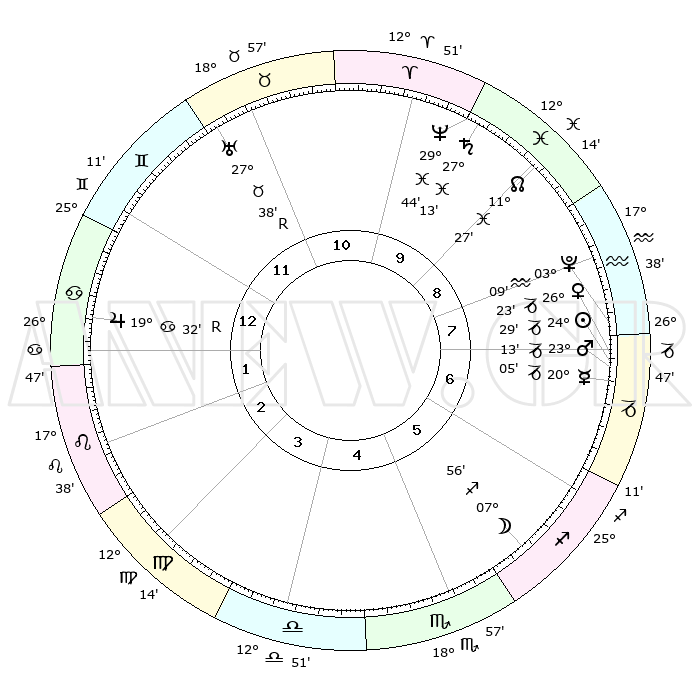 | | ΘΕΣΕΙΣ ΠΛΑΝΗΤΩΝ ΑΣΤΡΟΛΟΓΙΚΟΥ ΧΑΡΤΗ ΤΗΣ ΣΤΙΓΜΗΣ ΑΥΤΗΣ | | | | Πλανήτης | Ζώδιο | Μοίρες | Δεκαήμ. | Σε οίκο | Απόκλιση | | Ακμές των οίκων | | Ηλιος | Αιγόκερως | 24°25' | Τρίτο | 7 | 21 S 14 | | 1ος | 06°57' | Καρκίνος | | Σελήνη | Τοξότης | 07°09' | Πρώτο | 6 | 26 S 33 | | 2ος | 27°27' | Καρκίνος | | Ερμής | Αιγόκερως | 19°58' | Δεύτερο | 7 | 23 S 41 | | 3ος | 19°47' | Λέων | | Αφροδίτη | Αιγόκερως | 26°18' | Τρίτο | 7 | 21 S 50 | | 4ος | 17°14' | Παρθένος | | Αρης | Αιγόκερως | 23°10' | Τρίτο | 7 | 22 S 24 | | 5ος | 22°10' | Ζυγός | | Δίας | Καρκίνος | 19°32'R | Δεύτερο | 1 | 22 N 17 | | 6ος | 01°30' | Τοξότης | | Κρόνος | Ιχθείς | 27°13' | Τρίτο | 10 | 03 S 09 | | 7ος | 06°57' | Αιγόκερως | | Ουρανός | Ταύρος | 27°38'R | Τρίτο | 11 | 19 N 26 | | 8ος | 27°27' | Αιγόκερως | | Ποσειδώνας | Ιχθείς | 29°44' | Τρίτο | 10 | 01 S 19 | | 9ος | 19°47' | Υδροχόος | | Πλούτωνας | Υδροχόος | 03°09' | Πρώτο | 8 | 23 S 08 | | 10ος | 17°14' | Ιχθείς | | Β. Δεσμός | Ιχθείς | 11°27' | Δεύτερο | 9 | 07 S 16 | | 11ος | 22°10' | Κριός | | Ωροσκόπος | Καρκίνος | 06°57' | Πρώτο | | | 12ος | 01°30' | Δίδυμοι | | Μεσουράνημα | Ιχθείς | 17°14' | Δεύτερο | | | |