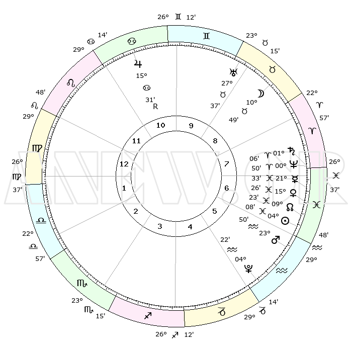 | | ΘΕΣΕΙΣ ΠΛΑΝΗΤΩΝ ΑΣΤΡΟΛΟΓΙΚΟΥ ΧΑΡΤΗ ΤΗΣ ΣΤΙΓΜΗΣ ΑΥΤΗΣ | | | | Πλανήτης | Ζώδιο | Μοίρες | Δεκαήμ. | Σε οίκο | Απόκλιση | | Ακμές των οίκων | | Ηλιος | Ιχθείς | 04°03' | Πρώτο | 6 | 10 S 01 | | 1ος | 04°35' | Παρθένος | | Σελήνη | Ταύρος | 09°45' | Πρώτο | 9 | 19 N 06 | | 2ος | 28°55' | Παρθένος | | Ερμής | Ιχθείς | 21°30' | Τρίτο | 7 | 01 S 35 | | 3ος | 27°59' | Ζυγός | | Αφροδίτη | Ιχθείς | 15°20' | Δεύτερο | 7 | 07 S 06 | | 4ος | 00°56' | Τοξότης | | Αρης | Υδροχόος | 23°46' | Τρίτο | 6 | 14 S 37 | | 5ος | 04°49' | Αιγόκερως | | Δίας | Καρκίνος | 15°32'R | Δεύτερο | 11 | 22 N 52 | | 6ος | 06°27' | Υδροχόος | | Κρόνος | Κριός | 01°06' | Πρώτο | 8 | 01 S 32 | | 7ος | 04°35' | Ιχθείς | | Ουρανός | Ταύρος | 27°37' | Τρίτο | 9 | 19 N 27 | | 8ος | 28°55' | Ιχθείς | | Ποσειδώνας | Κριός | 00°50' | Πρώτο | 8 | 00 S 52 | | 9ος | 27°59' | Κριός | | Πλούτωνας | Υδροχόος | 04°22' | Πρώτο | 5 | 22 S 54 | | 10ος | 00°56' | Δίδυμοι | | Β. Δεσμός | Ιχθείς | 09°23' | Πρώτο | 7 | 08 S 03 | | 11ος | 04°50' | Καρκίνος | | Ωροσκόπος | Παρθένος | 04°35' | Πρώτο | | | 12ος | 06°27' | Λέων | | Μεσουράνημα | Δίδυμοι | 00°56' | Πρώτο | | | |