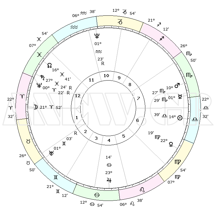 | ΘΕΣΕΙΣ ΠΛΑΝΗΤΩΝ ΑΣΤΡΟΛΟΓΙΚΟΥ ΧΑΡΤΗ ΤΗΣ ΣΤΙΓΜΗΣ ΑΥΤΗΣ | | Πλανήτης | Ζώδιο | Μοίρες | Δεκαήμ. | Σε οίκο | Απόκλιση | | Ακμές των οίκων | Ηλιος | Ζυγός | 14°34' | Δεύτερο | 7 | 05 S 44 | | 1ος | 02°03' | Ιχθείς | Σελήνη | Κριός | 20°33' | Τρίτο | 2 | 10 N 37 | | 2ος | 17°18' | Κριός | Ερμής | Σκορπιός | 01°21' | Πρώτο | 8 | 12 S 47 | | 3ος | 19°36' | Ταύρος | Αφροδίτη | Παρθένος | 22°13' | Τρίτο | 7 | 04 N 24 | | 4ος | 13°48' | Δίδυμοι | Αρης | Σκορπιός | 10°23' | Δεύτερο | 8 | 15 S 04 | | 5ος | 05°29' | Καρκίνος | Δίας | Καρκίνος | 23°13' | Τρίτο | 5 | 21 N 28 | | 6ος | 29°16' | Καρκίνος | Κρόνος | Ιχθείς | 27°24'R | Τρίτο | 1 | 03 S 20 | | 7ος | 02°03' | Παρθένος | Ουρανός | Δίδυμοι | 01°03'R | Πρώτο | 3 | 20 N 10 | | 8ος | 17°18' | Ζυγός | Ποσειδώνας | Κριός | 00°22'R | Πρώτο | 1 | 01 S 07 | | 9ος | 19°36' | Σκορπιός | Πλούτωνας | Υδροχόος | 01°23'R | Πρώτο | 12 | 23 S 32 | | 10ος | 13°48' | Τοξότης | Β. Δεσμός | Ιχθείς | 16°42' | Δεύτερο | 1 | 05 S 15 | | 11ος | 05°29' | Αιγόκερως | Ωροσκόπος | Ιχθείς | 02°03' | Πρώτο | | | 12ος | 29°16' | Αιγόκερως | Μεσουράνημα | Τοξότης | 13°48' | Δεύτερο | | | |
