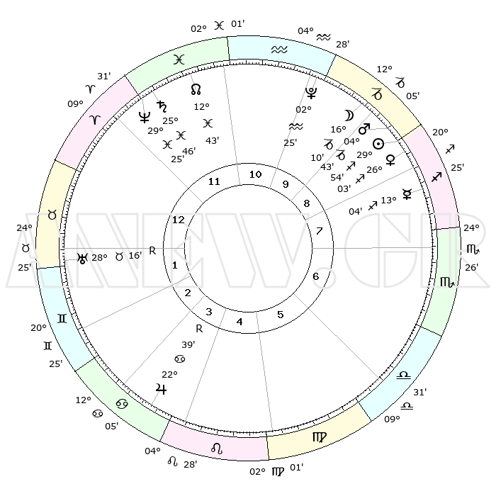 | | ΘΕΣΕΙΣ ΠΛΑΝΗΤΩΝ ΑΣΤΡΟΛΟΓΙΚΟΥ ΧΑΡΤΗ ΤΗΣ ΣΤΙΓΜΗΣ ΑΥΤΗΣ | | | | Πλανήτης | Ζώδιο | Μοίρες | Δεκαήμ. | Σε οίκο | Απόκλιση | | Ακμές των οίκων | | Ηλιος | Τοξότης | 29°50' | Τρίτο | 9 | 23 S 26 | | 1ος | 19°21' | Κριός | | Σελήνη | Αιγόκερως | 15°19' | Δεύτερο | 10 | 26 S 42 | | 2ος | 24°32' | Ταύρος | | Ερμής | Τοξότης | 12°58' | Δεύτερο | 8 | 21 S 39 | | 3ος | 19°17' | Δίδυμοι | | Αφροδίτη | Τοξότης | 25°58' | Τρίτο | 9 | 23 S 28 | | 4ος | 11°02' | Καρκίνος | | Αρης | Αιγόκερως | 04°40' | Πρώτο | 9 | 24 S 10 | | 5ος | 04°30' | Λέων | | Δίας | Καρκίνος | 22°40'R | Τρίτο | 4 | 21 N 44 | | 6ος | 05°10' | Παρθένος | | Κρόνος | Ιχθείς | 25°46' | Τρίτο | 12 | 03 S 47 | | 7ος | 19°21' | Ζυγός | | Ουρανός | Ταύρος | 28°16'R | Τρίτο | 2 | 19 N 34 | | 8ος | 24°32' | Σκορπιός | | Ποσειδώνας | Ιχθείς | 29°24' | Τρίτο | 12 | 01 S 28 | | 9ος | 19°17' | Τοξότης | | Πλούτωνας | Υδροχόος | 02°25' | Πρώτο | 10 | 23 S 17 | | 10ος | 11°02' | Αιγόκερως | | Β. Δεσμός | Ιχθείς | 12°44' | Δεύτερο | 12 | 06 S 47 | | 11ος | 04°30' | Υδροχόος | | Ωροσκόπος | Κριός | 19°21' | Δεύτερο | | | 12ος | 05°10' | Ιχθείς | | Μεσουράνημα | Αιγόκερως | 11°02' | Δεύτερο | | | |