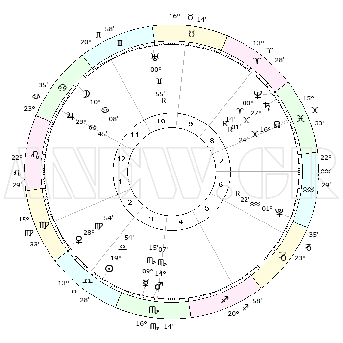 | ΘΕΣΕΙΣ ΠΛΑΝΗΤΩΝ ΑΣΤΡΟΛΟΓΙΚΟΥ ΧΑΡΤΗ ΤΗΣ ΣΤΙΓΜΗΣ ΑΥΤΗΣ | | Πλανήτης | Ζώδιο | Μοίρες | Δεκαήμ. | Σε οίκο | Απόκλιση | | Ακμές των οίκων | Ηλιος | Ζυγός | 19°49' | Δεύτερο | 4 | 07 S 45 | | 1ος | 23°35' | Καρκίνος | Σελήνη | Καρκίνος | 08°45' | Πρώτο | 12 | 28 N 01 | | 2ος | 14°16' | Λέων | Ερμής | Σκορπιός | 09°06' | Πρώτο | 4 | 15 S 57 | | 3ος | 08°28' | Παρθένος | Αφροδίτη | Παρθένος | 28°47' | Τρίτο | 3 | 01 N 51 | | 4ος | 08°37' | Ζυγός | Αρης | Σκορπιός | 14°03' | Δεύτερο | 4 | 16 S 15 | | 5ος | 14°42' | Σκορπιός | Δίας | Καρκίνος | 23°45' | Τρίτο | 1 | 21 N 23 | | 6ος | 21°29' | Τοξότης | Κρόνος | Ιχθείς | 27°02'R | Τρίτο | 9 | 03 S 29 | | 7ος | 23°35' | Αιγόκερως | Ουρανός | Δίδυμοι | 00°55'R | Πρώτο | 11 | 20 N 08 | | 8ος | 14°16' | Υδροχόος | Ποσειδώνας | Κριός | 00°14'R | Πρώτο | 9 | 01 S 10 | | 9ος | 08°28' | Ιχθείς | Πλούτωνας | Υδροχόος | 01°22'R | Πρώτο | 7 | 23 S 32 | | 10ος | 08°37' | Κριός | Β. Δεσμός | Ιχθείς | 16°25' | Δεύτερο | 9 | 05 S 22 | | 11ος | 14°42' | Ταύρος | Ωροσκόπος | Καρκίνος | 23°35' | Τρίτο | | | 12ος | 21°29' | Δίδυμοι | Μεσουράνημα | Κριός | 08°37' | Πρώτο | | | |