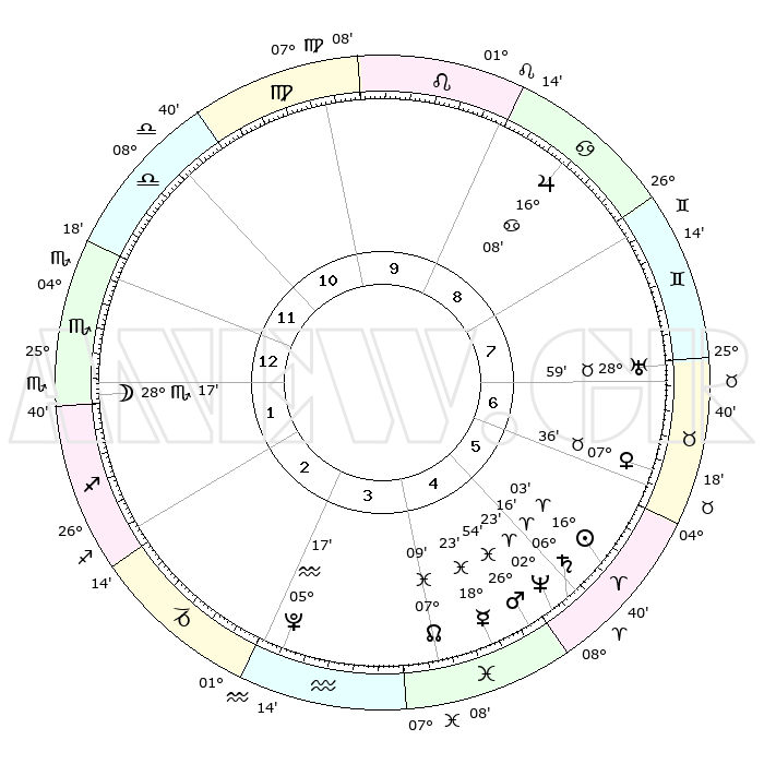 | | ΘΕΣΕΙΣ ΠΛΑΝΗΤΩΝ ΑΣΤΡΟΛΟΓΙΚΟΥ ΧΑΡΤΗ ΤΗΣ ΣΤΙΓΜΗΣ ΑΥΤΗΣ | | | | Πλανήτης | Ζώδιο | Μοίρες | Δεκαήμ. | Σε οίκο | Απόκλιση | | Ακμές των οίκων | | Ηλιος | Κριός | 15°59' | Δεύτερο | 6 | 06 N 17 | | 1ος | 06°21' | Σκορπιός | | Σελήνη | Σκορπιός | 27°29' | Τρίτο | 1 | 24 S 32 | | 2ος | 05°10' | Τοξότης | | Ερμής | Ιχθείς | 18°18' | Δεύτερο | 5 | 06 S 25 | | 3ος | 07°41' | Αιγόκερως | | Αφροδίτη | Ταύρος | 07°31' | Πρώτο | 7 | 13 N 47 | | 4ος | 12°19' | Υδροχόος | | Αρης | Ιχθείς | 26°51' | Τρίτο | 5 | 02 S 12 | | 5ος | 15°07' | Ιχθείς | | Δίας | Καρκίνος | 16°08' | Δεύτερο | 9 | 22 N 50 | | 6ος | 13°10' | Κριός | | Κρόνος | Κριός | 06°15' | Πρώτο | 5 | 00 N 31 | | 7ος | 06°21' | Ταύρος | | Ουρανός | Ταύρος | 28°59' | Τρίτο | 7 | 19 N 46 | | 8ος | 05°10' | Δίδυμοι | | Ποσειδώνας | Κριός | 02°23' | Πρώτο | 5 | 00 S 15 | | 9ος | 07°41' | Καρκίνος | | Πλούτωνας | Υδροχόος | 05°17' | Πρώτο | 3 | 22 S 47 | | 10ος | 12°19' | Λέων | | Β. Δεσμός | Ιχθείς | 07°09' | Πρώτο | 4 | 08 S 53 | | 11ος | 15°07' | Παρθένος | | Ωροσκόπος | Σκορπιός | 06°21' | Πρώτο | | | 12ος | 13°10' | Ζυγός | | Μεσουράνημα | Λέων | 12°19' | Δεύτερο | | | |