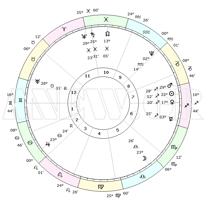 | | ΘΕΣΕΙΣ ΠΛΑΝΗΤΩΝ ΑΣΤΡΟΛΟΓΙΚΟΥ ΧΑΡΤΗ ΤΗΣ ΣΤΙΓΜΗΣ ΑΥΤΗΣ | | | | Πλανήτης | Ζώδιο | Μοίρες | Δεκαήμ. | Σε οίκο | Απόκλιση | | Ακμές των οίκων | | Ηλιος | Τοξότης | 22°35' | Τρίτο | 11 | 23 S 14 | | 1ος | 01°57' | Υδροχόος | | Σελήνη | Ζυγός | 20°15' | Τρίτο | 8 | 10 S 44 | | 2ος | 16°21' | Ιχθείς | | Ερμής | Τοξότης | 03°04' | Πρώτο | 10 | 19 S 11 | | 3ος | 24°29' | Κριός | | Αφροδίτη | Τοξότης | 16°60' | Δεύτερο | 11 | 22 S 36 | | 4ος | 22°37' | Ταύρος | | Αρης | Τοξότης | 29°17' | Τρίτο | 11 | 24 S 12 | | 5ος | 15°15' | Δίδυμοι | | Δίας | Καρκίνος | 23°26'R | Τρίτο | 6 | 21 N 35 | | 6ος | 06°44' | Καρκίνος | | Κρόνος | Ιχθείς | 25°31' | Τρίτο | 2 | 03 S 55 | | 7ος | 01°57' | Λέων | | Ουρανός | Ταύρος | 28°31'R | Τρίτο | 4 | 19 N 38 | | 8ος | 16°21' | Παρθένος | | Ποσειδώνας | Ιχθείς | 29°23' | Τρίτο | 2 | 01 S 29 | | 9ος | 24°29' | Ζυγός | | Πλούτωνας | Υδροχόος | 02°13' | Πρώτο | 1 | 23 S 20 | | 10ος | 22°37' | Σκορπιός | | Β. Δεσμός | Ιχθείς | 13°06' | Δεύτερο | 1 | 06 S 38 | | 11ος | 15°15' | Τοξότης | | Ωροσκόπος | Υδροχόος | 01°57' | Πρώτο | | | 12ος | 06°44' | Αιγόκερως | | Μεσουράνημα | Σκορπιός | 22°37' | Τρίτο | | | |
