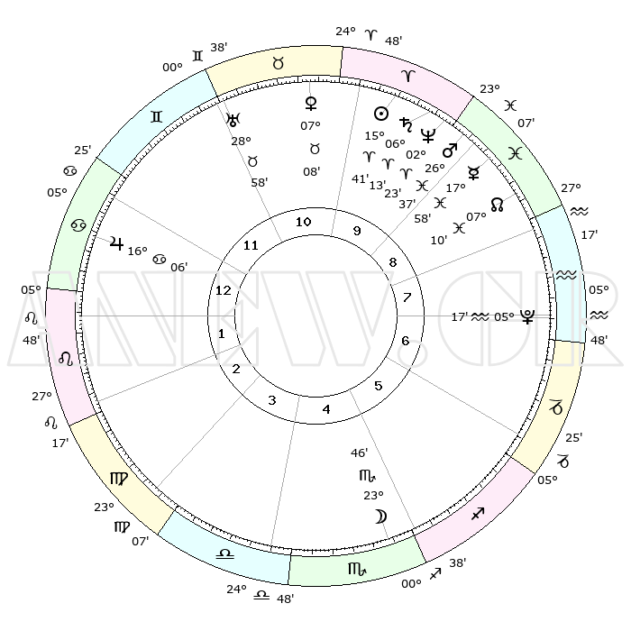 | | ΘΕΣΕΙΣ ΠΛΑΝΗΤΩΝ ΑΣΤΡΟΛΟΓΙΚΟΥ ΧΑΡΤΗ ΤΗΣ ΣΤΙΓΜΗΣ ΑΥΤΗΣ | | | | Πλανήτης | Ζώδιο | Μοίρες | Δεκαήμ. | Σε οίκο | Απόκλιση | | Ακμές των οίκων | | Ηλιος | Κριός | 15°22' | Δεύτερο | 1 | 06 N 03 | | 1ος | 27°24' | Ιχθείς | | Σελήνη | Σκορπιός | 19°57' | Δεύτερο | 8 | 22 S 26 | | 2ος | 08°19' | Ταύρος | | Ερμής | Ιχθείς | 17°38' | Δεύτερο | 12 | 06 S 36 | | 3ος | 06°07' | Δίδυμοι | | Αφροδίτη | Ταύρος | 06°45' | Πρώτο | 1 | 13 N 31 | | 4ος | 28°33' | Δίδυμοι | | Αρης | Ιχθείς | 26°22' | Τρίτο | 12 | 02 S 23 | | 5ος | 20°44' | Καρκίνος | | Δίας | Καρκίνος | 16°05' | Δεύτερο | 4 | 22 N 50 | | 6ος | 17°45' | Λέων | | Κρόνος | Κριός | 06°11' | Πρώτο | 1 | 00 N 30 | | 7ος | 27°24' | Παρθένος | | Ουρανός | Ταύρος | 28°57' | Τρίτο | 2 | 19 N 45 | | 8ος | 08°19' | Σκορπιός | | Ποσειδώνας | Κριός | 02°22' | Πρώτο | 1 | 00 S 16 | | 9ος | 06°07' | Τοξότης | | Πλούτωνας | Υδροχόος | 05°17' | Πρώτο | 11 | 22 S 47 | | 10ος | 28°33' | Τοξότης | | Β. Δεσμός | Ιχθείς | 07°11' | Πρώτο | 12 | 08 S 52 | | 11ος | 20°44' | Αιγόκερως | | Ωροσκόπος | Ιχθείς | 27°24' | Τρίτο | | | 12ος | 17°45' | Υδροχόος | | Μεσουράνημα | Τοξότης | 28°33' | Τρίτο | | | |