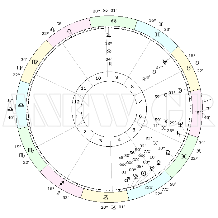 | | ΘΕΣΕΙΣ ΠΛΑΝΗΤΩΝ ΑΣΤΡΟΛΟΓΙΚΟΥ ΧΑΡΤΗ ΤΗΣ ΣΤΙΓΜΗΣ ΑΥΤΗΣ | | | | Πλανήτης | Ζώδιο | Μοίρες | Δεκαήμ. | Σε οίκο | Απόκλιση | | Ακμές των οίκων | | Ηλιος | Υδροχόος | 05°51' | Πρώτο | 5 | 18 S 48 | | 1ος | 23°56' | Παρθένος | | Σελήνη | Ταύρος | 00°52' | Πρώτο | 8 | 15 N 35 | | 2ος | 20°04' | Ζυγός | | Ερμής | Υδροχόος | 08°42' | Πρώτο | 5 | 20 S 06 | | 3ος | 20°15' | Σκορπιός | | Αφροδίτη | Υδροχόος | 10°26' | Δεύτερο | 5 | 18 S 50 | | 4ος | 23°11' | Τοξότης | | Αρης | Υδροχόος | 01°54' | Πρώτο | 5 | 20 S 43 | | 5ος | 26°16' | Αιγόκερως | | Δίας | Καρκίνος | 18°05'R | Δεύτερο | 10 | 22 N 30 | | 6ος | 26°56' | Υδροχόος | | Κρόνος | Ιχθείς | 28°10' | Τρίτο | 7 | 02 S 44 | | 7ος | 23°56' | Ιχθείς | | Ουρανός | Ταύρος | 27°30'R | Τρίτο | 9 | 19 N 25 | | 8ος | 20°04' | Κριός | | Ποσειδώνας | Ιχθείς | 29°59' | Τρίτο | 7 | 01 S 13 | | 9ος | 20°15' | Ταύρος | | Πλούτωνας | Υδροχόος | 03°30' | Πρώτο | 5 | 23 S 04 | | 10ος | 23°11' | Δίδυμοι | | Β. Δεσμός | Ιχθείς | 10°51' | Δεύτερο | 6 | 07 S 30 | | 11ος | 26°16' | Καρκίνος | | Ωροσκόπος | Παρθένος | 23°56' | Τρίτο | | | 12ος | 26°56' | Λέων | | Μεσουράνημα | Δίδυμοι | 23°11' | Τρίτο | | | |