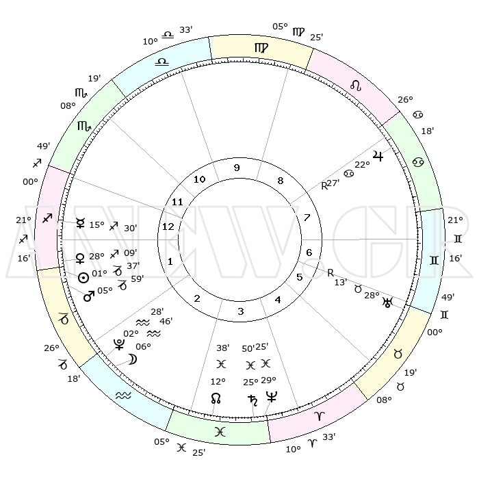 | | ΘΕΣΕΙΣ ΠΛΑΝΗΤΩΝ ΑΣΤΡΟΛΟΓΙΚΟΥ ΧΑΡΤΗ ΤΗΣ ΣΤΙΓΜΗΣ ΑΥΤΗΣ | | | | Πλανήτης | Ζώδιο | Μοίρες | Δεκαήμ. | Σε οίκο | Απόκλιση | | Ακμές των οίκων | | Ηλιος | Αιγόκερως | 01°32' | Πρώτο | 2 | 23 S 25 | | 1ος | 28°31' | Σκορπιός | | Σελήνη | Υδροχόος | 05°49' | Πρώτο | 3 | 21 S 39 | | 2ος | 29°26' | Τοξότης | | Ερμής | Τοξότης | 15°23' | Δεύτερο | 1 | 22 S 08 | | 3ος | 04°54' | Υδροχόος | | Αφροδίτη | Τοξότης | 28°03' | Τρίτο | 1 | 23 S 35 | | 4ος | 10°54' | Ιχθείς | | Αρης | Αιγόκερως | 05°56' | Πρώτο | 2 | 24 S 08 | | 5ος | 12°07' | Κριός | | Δίας | Καρκίνος | 22°28'R | Τρίτο | 8 | 21 N 46 | | 6ος | 07°22' | Ταύρος | | Κρόνος | Ιχθείς | 25°50' | Τρίτο | 4 | 03 S 45 | | 7ος | 28°31' | Ταύρος | | Ουρανός | Ταύρος | 28°13'R | Τρίτο | 6 | 19 N 34 | | 8ος | 29°26' | Δίδυμοι | | Ποσειδώνας | Ιχθείς | 29°25' | Τρίτο | 4 | 01 S 28 | | 9ος | 04°54' | Λέων | | Πλούτωνας | Υδροχόος | 02°28' | Πρώτο | 2 | 23 S 16 | | 10ος | 10°54' | Παρθένος | | Β. Δεσμός | Ιχθείς | 12°38' | Δεύτερο | 4 | 06 S 49 | | 11ος | 12°07' | Ζυγός | | Ωροσκόπος | Σκορπιός | 28°31' | Τρίτο | | | 12ος | 07°22' | Σκορπιός | | Μεσουράνημα | Παρθένος | 10°54' | Δεύτερο | | | |
