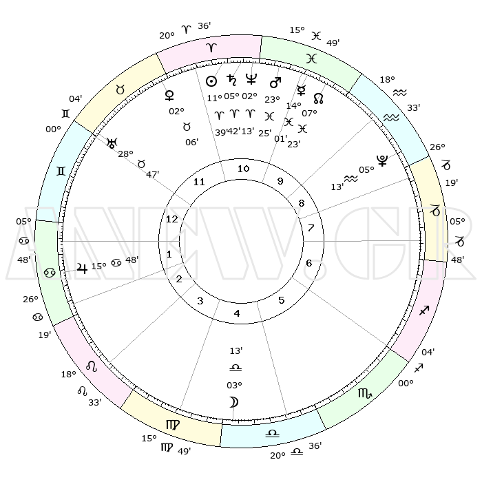 | | ΘΕΣΕΙΣ ΠΛΑΝΗΤΩΝ ΑΣΤΡΟΛΟΓΙΚΟΥ ΧΑΡΤΗ ΤΗΣ ΣΤΙΓΜΗΣ ΑΥΤΗΣ | | | | Πλανήτης | Ζώδιο | Μοίρες | Δεκαήμ. | Σε οίκο | Απόκλιση | | Ακμές των οίκων | | Ηλιος | Κριός | 11°35' | Δεύτερο | 11 | 04 N 35 | | 1ος | 11°41' | Δίδυμοι | | Σελήνη | Ζυγός | 02°20' | Πρώτο | 5 | 02 S 51 | | 2ος | 04°25' | Καρκίνος | | Ερμής | Ιχθείς | 13°58' | Δεύτερο | 10 | 07 S 33 | | 3ος | 25°38' | Καρκίνος | | Αφροδίτη | Ταύρος | 02°01' | Πρώτο | 12 | 11 N 46 | | 4ος | 19°28' | Λέων | | Αρης | Ιχθείς | 23°22' | Τρίτο | 11 | 03 S 36 | | 5ος | 20°04' | Παρθένος | | Δίας | Καρκίνος | 15°48' | Δεύτερο | 2 | 22 N 52 | | 6ος | 29°56' | Ζυγός | | Κρόνος | Κριός | 05°42' | Πρώτο | 11 | 00 N 18 | | 7ος | 11°41' | Τοξότης | | Ουρανός | Ταύρος | 28°47' | Τρίτο | 12 | 19 N 43 | | 8ος | 04°25' | Αιγόκερως | | Ποσειδώνας | Κριός | 02°13' | Πρώτο | 11 | 00 S 19 | | 9ος | 25°38' | Αιγόκερως | | Πλούτωνας | Υδροχόος | 05°13' | Πρώτο | 9 | 22 S 47 | | 10ος | 19°28' | Υδροχόος | | Β. Δεσμός | Ιχθείς | 07°23' | Πρώτο | 10 | 08 S 48 | | 11ος | 20°04' | Ιχθείς | | Ωροσκόπος | Δίδυμοι | 11°41' | Δεύτερο | | | 12ος | 29°56' | Κριός | | Μεσουράνημα | Υδροχόος | 19°28' | Δεύτερο | | | |