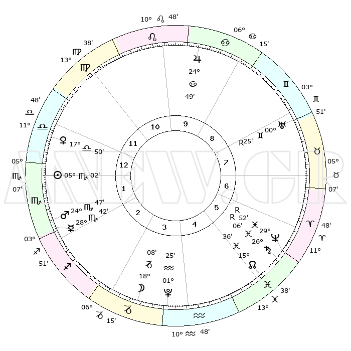 | | ΘΕΣΕΙΣ ΠΛΑΝΗΤΩΝ ΑΣΤΡΟΛΟΓΙΚΟΥ ΧΑΡΤΗ ΤΗΣ ΣΤΙΓΜΗΣ ΑΥΤΗΣ | | | | Πλανήτης | Ζώδιο | Μοίρες | Δεκαήμ. | Σε οίκο | Απόκλιση | | Ακμές των οίκων | | Ηλιος | Σκορπιός | 04°34' | Πρώτο | 5 | 13 S 02 | | 1ος | 15°31' | Δίδυμοι | | Σελήνη | Αιγόκερως | 12°28' | Δεύτερο | 8 | 27 S 28 | | 2ος | 07°43' | Καρκίνος | | Ερμής | Σκορπιός | 28°11' | Τρίτο | 6 | 22 S 28 | | 3ος | 28°57' | Καρκίνος | | Αφροδίτη | Ζυγός | 17°15' | Δεύτερο | 5 | 05 S 22 | | 4ος | 23°13' | Λέων | | Αρης | Σκορπιός | 24°27' | Τρίτο | 6 | 19 S 13 | | 5ος | 24°33' | Παρθένος | | Δίας | Καρκίνος | 24°47' | Τρίτο | 2 | 21 N 14 | | 6ος | 04°41' | Σκορπιός | | Κρόνος | Ιχθείς | 26°08'R | Τρίτο | 11 | 03 S 49 | | 7ος | 15°31' | Τοξότης | | Ουρανός | Δίδυμοι | 00°26'R | Πρώτο | 12 | 20 N 02 | | 8ος | 07°43' | Αιγόκερως | | Ποσειδώνας | Ιχθείς | 29°53'R | Τρίτο | 11 | 01 S 18 | | 9ος | 28°57' | Αιγόκερως | | Πλούτωνας | Υδροχόος | 01°25' | Πρώτο | 9 | 23 S 31 | | 10ος | 23°13' | Υδροχόος | | Β. Δεσμός | Ιχθείς | 15°38' | Δεύτερο | 10 | 05 S 40 | | 11ος | 24°33' | Ιχθείς | | Ωροσκόπος | Δίδυμοι | 15°31' | Δεύτερο | | | 12ος | 04°41' | Ταύρος | | Μεσουράνημα | Υδροχόος | 23°13' | Τρίτο | | | |
