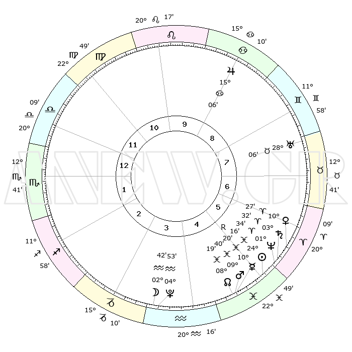 | | ΘΕΣΕΙΣ ΠΛΑΝΗΤΩΝ ΑΣΤΡΟΛΟΓΙΚΟΥ ΧΑΡΤΗ ΤΗΣ ΣΤΙΓΜΗΣ ΑΥΤΗΣ | | | | Πλανήτης | Ζώδιο | Μοίρες | Δεκαήμ. | Σε οίκο | Απόκλιση | | Ακμές των οίκων | | Ηλιος | Ιχθείς | 23°30' | Τρίτο | 2 | 02 S 35 | | 1ος | 22°24' | Αιγόκερως | | Σελήνη | Αιγόκερως | 23°03' | Τρίτο | 1 | 25 S 12 | | 2ος | 05°04' | Ιχθείς | | Ερμής | Ιχθείς | 10°50'R | Δεύτερο | 2 | 05 S 04 | | 3ος | 14°33' | Κριός | | Αφροδίτη | Κριός | 09°29' | Πρώτο | 2 | 02 N 46 | | 4ος | 14°22' | Ταύρος | | Αρης | Ιχθείς | 09°03' | Πρώτο | 2 | 09 S 11 | | 5ος | 07°47' | Δίδυμοι | | Δίας | Καρκίνος | 15°06' | Δεύτερο | 6 | 22 N 56 | | 6ος | 29°01' | Δίδυμοι | | Κρόνος | Κριός | 03°26' | Πρώτο | 2 | 00 S 35 | | 7ος | 22°24' | Καρκίνος | | Ουρανός | Ταύρος | 28°05' | Τρίτο | 4 | 19 N 33 | | 8ος | 05°04' | Παρθένος | | Ποσειδώνας | Κριός | 01°32' | Πρώτο | 2 | 00 S 35 | | 9ος | 14°33' | Ζυγός | | Πλούτωνας | Υδροχόος | 04°52' | Πρώτο | 1 | 22 S 50 | | 10ος | 14°22' | Σκορπιός | | Β. Δεσμός | Ιχθείς | 08°21' | Πρώτο | 2 | 08 S 26 | | 11ος | 07°47' | Τοξότης | | Ωροσκόπος | Αιγόκερως | 22°24' | Τρίτο | | | 12ος | 29°01' | Τοξότης | | Μεσουράνημα | Σκορπιός | 14°22' | Δεύτερο | | | |
