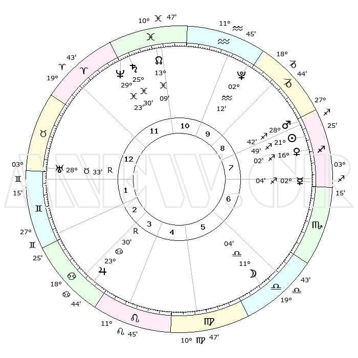 | | ΘΕΣΕΙΣ ΠΛΑΝΗΤΩΝ ΑΣΤΡΟΛΟΓΙΚΟΥ ΧΑΡΤΗ ΤΗΣ ΣΤΙΓΜΗΣ ΑΥΤΗΣ | | | | Πλανήτης | Ζώδιο | Μοίρες | Δεκαήμ. | Σε οίκο | Απόκλιση | | Ακμές των οίκων | | Ηλιος | Τοξότης | 22°11' | Τρίτο | 3 | 23 S 12 | | 1ος | 27°24' | Παρθένος | | Σελήνη | Ζυγός | 15°29' | Δεύτερο | 1 | 08 S 35 | | 2ος | 23°48' | Ζυγός | | Ερμής | Τοξότης | 02°33' | Πρώτο | 3 | 19 S 02 | | 3ος | 24°08' | Σκορπιός | | Αφροδίτη | Τοξότης | 16°30' | Δεύτερο | 3 | 22 S 33 | | 4ος | 27°05' | Τοξότης | | Αρης | Τοξότης | 28°59' | Τρίτο | 4 | 24 S 12 | | 5ος | 00°06' | Υδροχόος | | Δίας | Καρκίνος | 23°28'R | Τρίτο | 10 | 21 N 35 | | 6ος | 00°38' | Ιχθείς | | Κρόνος | Ιχθείς | 25°30' | Τρίτο | 6 | 03 S 55 | | 7ος | 27°24' | Ιχθείς | | Ουρανός | Ταύρος | 28°32'R | Τρίτο | 9 | 19 N 38 | | 8ος | 23°48' | Κριός | | Ποσειδώνας | Ιχθείς | 29°23' | Τρίτο | 7 | 01 S 29 | | 9ος | 24°08' | Ταύρος | | Πλούτωνας | Υδροχόος | 02°13' | Πρώτο | 5 | 23 S 20 | | 10ος | 27°05' | Δίδυμοι | | Β. Δεσμός | Ιχθείς | 13°08' | Δεύτερο | 6 | 06 S 38 | | 11ος | 00°06' | Λέων | | Ωροσκόπος | Παρθένος | 27°24' | Τρίτο | | | 12ος | 00°38' | Παρθένος | | Μεσουράνημα | Δίδυμοι | 27°05' | Τρίτο | | | |