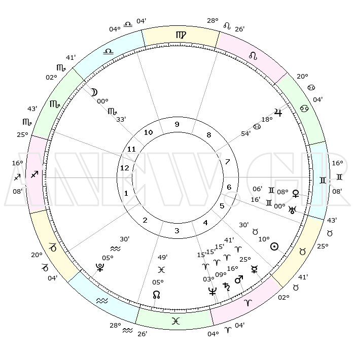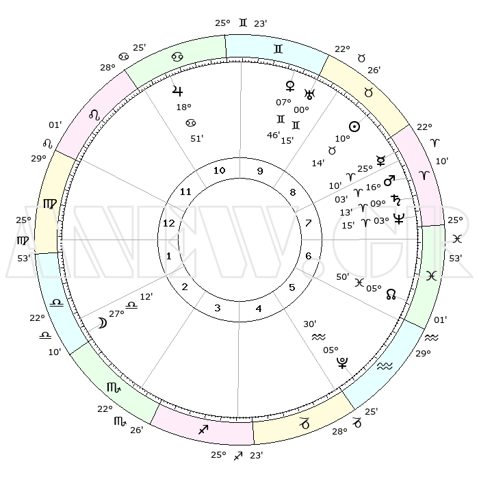 | | ΘΕΣΕΙΣ ΠΛΑΝΗΤΩΝ ΑΣΤΡΟΛΟΓΙΚΟΥ ΧΑΡΤΗ ΤΗΣ ΣΤΙΓΜΗΣ ΑΥΤΗΣ | | | | Πλανήτης | Ζώδιο | Μοίρες | Δεκαήμ. | Σε οίκο | Απόκλιση | | Ακμές των οίκων | | Ηλιος | Ταύρος | 08°46' | Πρώτο | 2 | 14 N 25 | | 1ος | 21°26' | Ιχθείς | | Σελήνη | Ζυγός | 08°40' | Πρώτο | 7 | 05 S 52 | | 2ος | 03°39' | Ταύρος | | Ερμής | Κριός | 22°26' | Τρίτο | 1 | 06 N 46 | | 3ος | 02°26' | Δίδυμοι | | Αφροδίτη | Δίδυμοι | 05°57' | Πρώτο | 3 | 22 N 06 | | 4ος | 25°10' | Δίδυμοι | | Αρης | Κριός | 14°54' | Δεύτερο | 1 | 05 N 02 | | 5ος | 17°10' | Καρκίνος | | Δίας | Καρκίνος | 18°39' | Δεύτερο | 5 | 22 N 31 | | 6ος | 13°19' | Λέων | | Κρόνος | Κριός | 09°03' | Πρώτο | 1 | 01 N 35 | | 7ος | 21°26' | Παρθένος | | Ουρανός | Δίδυμοι | 00°10' | Πρώτο | 2 | 20 N 01 | | 8ος | 03°39' | Σκορπιός | | Ποσειδώνας | Κριός | 03°12' | Πρώτο | 1 | 00 N 04 | | 9ος | 02°26' | Τοξότης | | Πλούτωνας | Υδροχόος | 05°30' | Πρώτο | 11 | 22 S 49 | | 10ος | 25°11' | Τοξότης | | Β. Δεσμός | Ιχθείς | 05°55' | Πρώτο | 12 | 09 S 20 | | 11ος | 17°10' | Αιγόκερως | | Ωροσκόπος | Ιχθείς | 21°26' | Τρίτο | | | 12ος | 13°19' | Υδροχόος | | Μεσουράνημα | Τοξότης | 25°11' | Τρίτο | | | |
