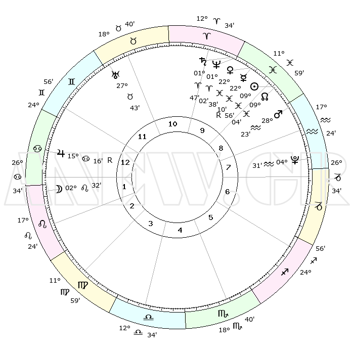 | | ΘΕΣΕΙΣ ΠΛΑΝΗΤΩΝ ΑΣΤΡΟΛΟΓΙΚΟΥ ΧΑΡΤΗ ΤΗΣ ΣΤΙΓΜΗΣ ΑΥΤΗΣ | | | | Πλανήτης | Ζώδιο | Μοίρες | Δεκαήμ. | Σε οίκο | Απόκλιση | | Ακμές των οίκων | | Ηλιος | Ιχθείς | 09°49' | Πρώτο | 10 | 07 S 53 | | 1ος | 20°56' | Δίδυμοι | | Σελήνη | Λέων | 00°58' | Πρώτο | 2 | 23 N 07 | | 2ος | 12°29' | Καρκίνος | | Ερμής | Ιχθείς | 22°12'R | Τρίτο | 10 | 00 S 09 | | 3ος | 03°50' | Λέων | | Αφροδίτη | Ιχθείς | 22°30' | Τρίτο | 10 | 04 S 14 | | 4ος | 28°48' | Λέων | | Αρης | Υδροχόος | 28°18' | Τρίτο | 9 | 13 S 05 | | 5ος | 01°10' | Ζυγός | | Δίας | Καρκίνος | 15°16'R | Δεύτερο | 2 | 22 N 54 | | 6ος | 11°28' | Σκορπιός | | Κρόνος | Κριός | 01°46' | Πρώτο | 11 | 01 S 15 | | 7ος | 20°56' | Τοξότης | | Ουρανός | Ταύρος | 27°43' | Τρίτο | 12 | 19 N 28 | | 8ος | 12°29' | Αιγόκερως | | Ποσειδώνας | Κριός | 01°02' | Πρώτο | 10 | 00 S 47 | | 9ος | 03°50' | Υδροχόος | | Πλούτωνας | Υδροχόος | 04°31' | Πρώτο | 9 | 22 S 53 | | 10ος | 28°48' | Υδροχόος | | Β. Δεσμός | Ιχθείς | 09°05' | Πρώτο | 10 | 08 S 10 | | 11ος | 01°10' | Κριός | | Ωροσκόπος | Δίδυμοι | 20°56' | Τρίτο | | | 12ος | 11°28' | Ταύρος | | Μεσουράνημα | Υδροχόος | 28°48' | Τρίτο | | | |