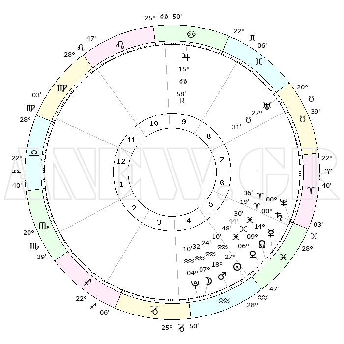| | ΘΕΣΕΙΣ ΠΛΑΝΗΤΩΝ ΑΣΤΡΟΛΟΓΙΚΟΥ ΧΑΡΤΗ ΤΗΣ ΣΤΙΓΜΗΣ ΑΥΤΗΣ | | | | Πλανήτης | Ζώδιο | Μοίρες | Δεκαήμ. | Σε οίκο | Απόκλιση | | Ακμές των οίκων | | Ηλιος | Υδροχόος | 26°35' | Τρίτο | 12 | 12 S 39 | | 1ος | 25°05' | Ιχθείς | | Σελήνη | Υδροχόος | 00°08' | Πρώτο | 11 | 23 S 21 | | 2ος | 06°32' | Ταύρος | | Ερμής | Ιχθείς | 13°40' | Δεύτερο | 12 | 06 S 19 | | 3ος | 04°42' | Δίδυμοι | | Αφροδίτη | Ιχθείς | 06°05' | Πρώτο | 12 | 10 S 39 | | 4ος | 27°15' | Δίδυμοι | | Αρης | Υδροχόος | 17°56' | Δεύτερο | 12 | 16 S 29 | | 5ος | 19°21' | Καρκίνος | | Δίας | Καρκίνος | 16°00'R | Δεύτερο | 4 | 22 N 48 | | 6ος | 16°01' | Λέων | | Κρόνος | Κριός | 00°15' | Πρώτο | 1 | 01 S 52 | | 7ος | 25°05' | Παρθένος | | Ουρανός | Ταύρος | 27°31' | Τρίτο | 2 | 19 N 25 | | 8ος | 06°32' | Σκορπιός | | Ποσειδώνας | Κριός | 00°35' | Πρώτο | 1 | 00 S 58 | | 9ος | 04°42' | Τοξότης | | Πλούτωνας | Υδροχόος | 04°09' | Πρώτο | 11 | 22 S 56 | | 10ος | 27°15' | Τοξότης | | Β. Δεσμός | Ιχθείς | 09°46' | Πρώτο | 12 | 07 S 54 | | 11ος | 19°21' | Αιγόκερως | | Ωροσκόπος | Ιχθείς | 25°05' | Τρίτο | | | 12ος | 16°01' | Υδροχόος | | Μεσουράνημα | Τοξότης | 27°15' | Τρίτο | | | |