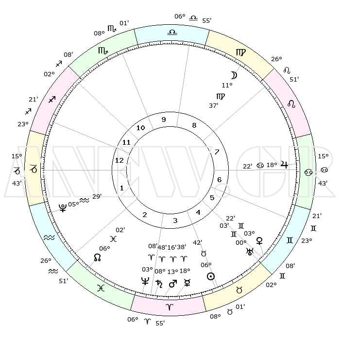 | | ΘΕΣΕΙΣ ΠΛΑΝΗΤΩΝ ΑΣΤΡΟΛΟΓΙΚΟΥ ΧΑΡΤΗ ΤΗΣ ΣΤΙΓΜΗΣ ΑΥΤΗΣ | | | | Πλανήτης | Ζώδιο | Μοίρες | Δεκαήμ. | Σε οίκο | Απόκλιση | | Ακμές των οίκων | | Ηλιος | Ταύρος | 05°37' | Πρώτο | 5 | 13 N 23 | | 1ος | 04°56' | Τοξότης | | Σελήνη | Λέων | 26°57' | Τρίτο | 9 | 13 N 24 | | 2ος | 06°48' | Αιγόκερως | | Ερμής | Κριός | 16°42' | Δεύτερο | 4 | 04 N 22 | | 3ος | 13°20' | Υδροχόος | | Αφροδίτη | Δίδυμοι | 02°00' | Πρώτο | 6 | 21 N 13 | | 4ος | 19°26' | Ιχθείς | | Αρης | Κριός | 12°24' | Δεύτερο | 4 | 04 N 03 | | 5ος | 19°48' | Κριός | | Δίας | Καρκίνος | 18°13' | Δεύτερο | 8 | 22 N 35 | | 6ος | 14°12' | Ταύρος | | Κρόνος | Κριός | 08°40' | Πρώτο | 4 | 01 N 27 | | 7ος | 04°56' | Δίδυμοι | | Ουρανός | Ταύρος | 29°60' | Τρίτο | 6 | 19 N 59 | | 8ος | 06°48' | Καρκίνος | | Ποσειδώνας | Κριός | 03°06' | Πρώτο | 4 | 00 N 01 | | 9ος | 13°20' | Λέων | | Πλούτωνας | Υδροχόος | 05°29' | Πρώτο | 2 | 22 S 48 | | 10ος | 19°26' | Παρθένος | | Β. Δεσμός | Ιχθείς | 06°05' | Πρώτο | 3 | 09 S 17 | | 11ος | 19°48' | Ζυγός | | Ωροσκόπος | Τοξότης | 04°56' | Πρώτο | | | 12ος | 14°12' | Σκορπιός | | Μεσουράνημα | Παρθένος | 19°26' | Δεύτερο | | | |