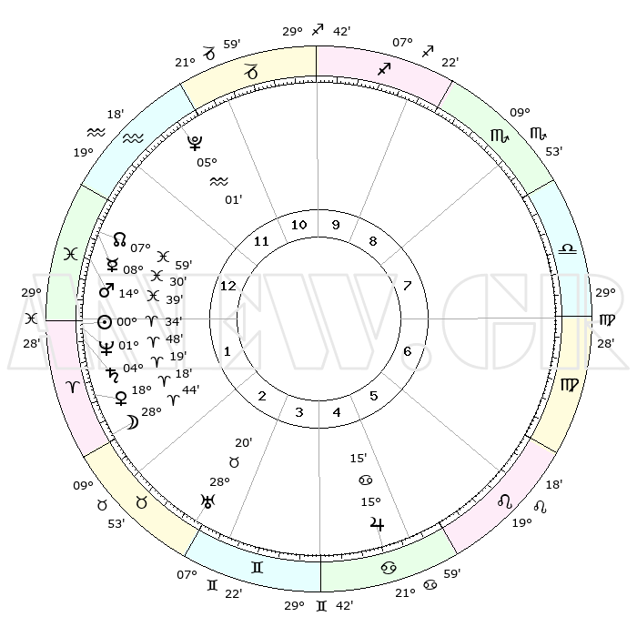 | | ΘΕΣΕΙΣ ΠΛΑΝΗΤΩΝ ΑΣΤΡΟΛΟΓΙΚΟΥ ΧΑΡΤΗ ΤΗΣ ΣΤΙΓΜΗΣ ΑΥΤΗΣ | | | | Πλανήτης | Ζώδιο | Μοίρες | Δεκαήμ. | Σε οίκο | Απόκλιση | | Ακμές των οίκων | | Ηλιος | Κριός | 01°23' | Πρώτο | 3 | 00 N 33 | | 1ος | 02°04' | Αιγόκερως | | Σελήνη | Ταύρος | 10°26' | Δεύτερο | 4 | 19 N 19 | | 2ος | 09°44' | Υδροχόος | | Ερμής | Ιχθείς | 08°34' | Πρώτο | 2 | 07 S 42 | | 3ος | 19°52' | Ιχθείς | | Αφροδίτη | Κριός | 19°18' | Δεύτερο | 3 | 06 N 48 | | 4ος | 23°28' | Κριός | | Αρης | Ιχθείς | 15°17' | Δεύτερο | 2 | 06 S 47 | | 5ος | 19°28' | Ταύρος | | Δίας | Καρκίνος | 15°17' | Δεύτερο | 7 | 22 N 55 | | 6ος | 11°08' | Δίδυμοι | | Κρόνος | Κριός | 04°25' | Πρώτο | 3 | 00 S 12 | | 7ος | 02°04' | Καρκίνος | | Ουρανός | Ταύρος | 28°21' | Τρίτο | 5 | 19 N 37 | | 8ος | 09°44' | Λέων | | Ποσειδώνας | Κριός | 01°50' | Πρώτο | 3 | 00 S 28 | | 9ος | 19°52' | Παρθένος | | Πλούτωνας | Υδροχόος | 05°02' | Πρώτο | 1 | 22 S 48 | | 10ος | 23°28' | Ζυγός | | Β. Δεσμός | Ιχθείς | 07°56' | Πρώτο | 2 | 08 S 36 | | 11ος | 19°28' | Σκορπιός | | Ωροσκόπος | Αιγόκερως | 02°04' | Πρώτο | | | 12ος | 11°08' | Τοξότης | | Μεσουράνημα | Ζυγός | 23°28' | Τρίτο | | | |