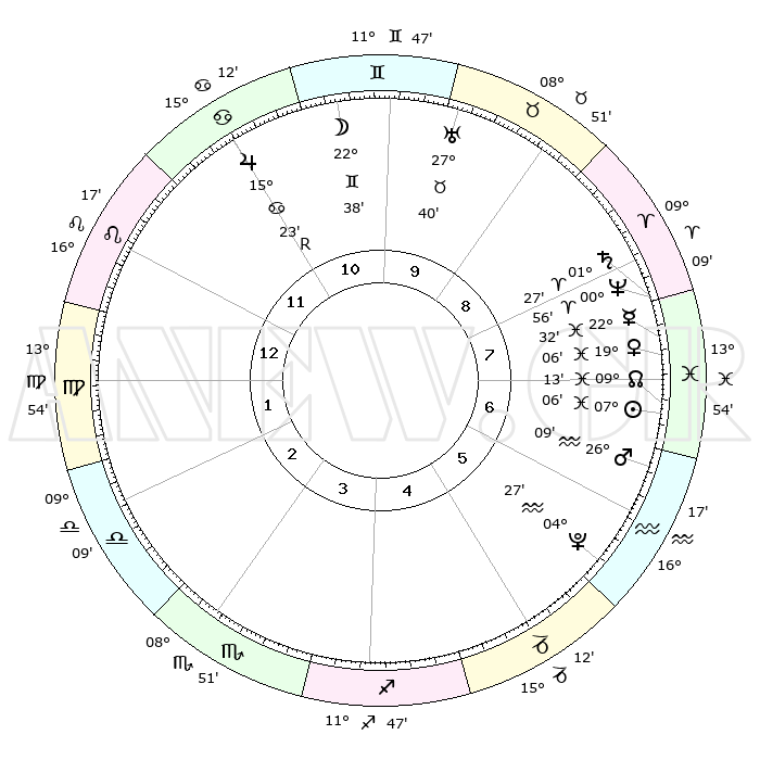 | | ΘΕΣΕΙΣ ΠΛΑΝΗΤΩΝ ΑΣΤΡΟΛΟΓΙΚΟΥ ΧΑΡΤΗ ΤΗΣ ΣΤΙΓΜΗΣ ΑΥΤΗΣ | | | | Πλανήτης | Ζώδιο | Μοίρες | Δεκαήμ. | Σε οίκο | Απόκλιση | | Ακμές των οίκων | | Ηλιος | Ιχθείς | 07°21' | Πρώτο | 3 | 08 S 49 | | 1ος | 28°13' | Σκορπιός | | Σελήνη | Δίδυμοι | 26°14' | Τρίτο | 7 | 28 N 25 | | 2ος | 29°07' | Τοξότης | | Ερμής | Ιχθείς | 22°33' | Τρίτο | 4 | 00 S 27 | | 3ος | 04°31' | Υδροχόος | | Αφροδίτη | Ιχθείς | 19°25' | Δεύτερο | 4 | 05 S 28 | | 4ος | 10°31' | Ιχθείς | | Αρης | Υδροχόος | 26°21' | Τρίτο | 3 | 13 S 45 | | 5ος | 11°46' | Κριός | | Δίας | Καρκίνος | 15°22'R | Δεύτερο | 8 | 22 N 53 | | 6ος | 07°04' | Ταύρος | | Κρόνος | Κριός | 01°29' | Πρώτο | 4 | 01 S 22 | | 7ος | 28°13' | Ταύρος | | Ουρανός | Ταύρος | 27°40' | Τρίτο | 6 | 19 N 28 | | 8ος | 29°07' | Δίδυμοι | | Ποσειδώνας | Κριός | 00°56' | Πρώτο | 4 | 00 S 50 | | 9ος | 04°31' | Λέων | | Πλούτωνας | Υδροχόος | 04°27' | Πρώτο | 2 | 22 S 53 | | 10ος | 10°31' | Παρθένος | | Β. Δεσμός | Ιχθείς | 09°12' | Πρώτο | 3 | 08 S 07 | | 11ος | 11°46' | Ζυγός | | Ωροσκόπος | Σκορπιός | 28°13' | Τρίτο | | | 12ος | 07°04' | Σκορπιός | | Μεσουράνημα | Παρθένος | 10°31' | Δεύτερο | | | |