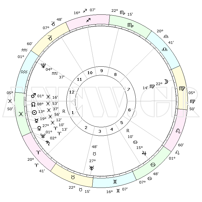 | | ΘΕΣΕΙΣ ΠΛΑΝΗΤΩΝ ΑΣΤΡΟΛΟΓΙΚΟΥ ΧΑΡΤΗ ΤΗΣ ΣΤΙΓΜΗΣ ΑΥΤΗΣ | | | | Πλανήτης | Ζώδιο | Μοίρες | Δεκαήμ. | Σε οίκο | Απόκλιση | | Ακμές των οίκων | | Ηλιος | Ιχθείς | 13°33' | Δεύτερο | 1 | 06 S 28 | | 1ος | 05°47' | Υδροχόος | | Σελήνη | Παρθένος | 21°27' | Τρίτο | 8 | 02 N 20 | | 2ος | 20°43' | Ιχθείς | | Ερμής | Ιχθείς | 19°59'R | Δεύτερο | 1 | 00 S 37 | | 3ος | 28°11' | Κριός | | Αφροδίτη | Ιχθείς | 27°08' | Τρίτο | 2 | 02 S 20 | | 4ος | 25°42' | Ταύρος | | Αρης | Ιχθείς | 01°13' | Πρώτο | 1 | 12 S 04 | | 5ος | 18°05' | Δίδυμοι | | Δίας | Καρκίνος | 15°10'R | Δεύτερο | 6 | 22 N 55 | | 6ος | 09°45' | Καρκίνος | | Κρόνος | Κριός | 02°13' | Πρώτο | 2 | 01 S 04 | | 7ος | 05°47' | Λέων | | Ουρανός | Ταύρος | 27°48' | Τρίτο | 4 | 19 N 29 | | 8ος | 20°43' | Παρθένος | | Ποσειδώνας | Κριός | 01°10' | Πρώτο | 2 | 00 S 44 | | 9ος | 28°11' | Ζυγός | | Πλούτωνας | Υδροχόος | 04°37' | Πρώτο | 12 | 22 S 52 | | 10ος | 25°42' | Σκορπιός | | Β. Δεσμός | Ιχθείς | 08°53' | Πρώτο | 1 | 08 S 14 | | 11ος | 18°05' | Τοξότης | | Ωροσκόπος | Υδροχόος | 05°47' | Πρώτο | | | 12ος | 09°45' | Αιγόκερως | | Μεσουράνημα | Σκορπιός | 25°42' | Τρίτο | | | |