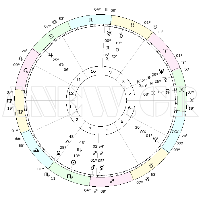 | | ΘΕΣΕΙΣ ΠΛΑΝΗΤΩΝ ΑΣΤΡΟΛΟΓΙΚΟΥ ΧΑΡΤΗ ΤΗΣ ΣΤΙΓΜΗΣ ΑΥΤΗΣ | | | | Πλανήτης | Ζώδιο | Μοίρες | Δεκαήμ. | Σε οίκο | Απόκλιση | | Ακμές των οίκων | | Ηλιος | Σκορπιός | 13°41' | Δεύτερο | 4 | 15 S 57 | | 1ος | 01°13' | Λέων | | Σελήνη | Ταύρος | 17°58' | Δεύτερο | 10 | 21 N 27 | | 2ος | 22°20' | Λέων | | Ερμής | Τοξότης | 05°51' | Πρώτο | 5 | 24 S 00 | | 3ος | 17°33' | Παρθένος | | Αφροδίτη | Ζυγός | 28°39' | Τρίτο | 4 | 09 S 41 | | 4ος | 18°44' | Ζυγός | | Αρης | Τοξότης | 00°57' | Πρώτο | 5 | 20 S 46 | | 5ος | 24°45' | Σκορπιός | | Δίας | Καρκίνος | 25°06' | Τρίτο | 12 | 21 N 12 | | 6ος | 00°15' | Αιγόκερως | | Κρόνος | Ιχθείς | 25°43'R | Τρίτο | 9 | 03 S 57 | | 7ος | 01°13' | Υδροχόος | | Ουρανός | Δίδυμοι | 00°05'R | Πρώτο | 11 | 19 N 57 | | 8ος | 22°20' | Υδροχόος | | Ποσειδώνας | Ιχθείς | 29°42'R | Τρίτο | 9 | 01 S 22 | | 9ος | 17°33' | Ιχθείς | | Πλούτωνας | Υδροχόος | 01°30' | Πρώτο | 7 | 23 S 30 | | 10ος | 18°44' | Κριός | | Β. Δεσμός | Ιχθείς | 15°09' | Δεύτερο | 8 | 05 S 51 | | 11ος | 24°45' | Ταύρος | | Ωροσκόπος | Λέων | 01°13' | Πρώτο | | | 12ος | 00°15' | Καρκίνος | | Μεσουράνημα | Κριός | 18°44' | Δεύτερο | | | |