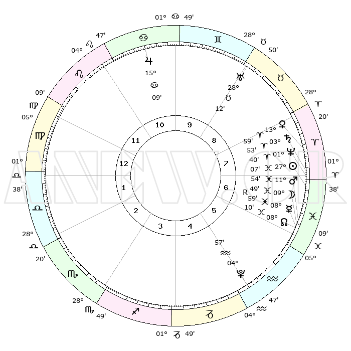 | | ΘΕΣΕΙΣ ΠΛΑΝΗΤΩΝ ΑΣΤΡΟΛΟΓΙΚΟΥ ΧΑΡΤΗ ΤΗΣ ΣΤΙΓΜΗΣ ΑΥΤΗΣ | | | | Πλανήτης | Ζώδιο | Μοίρες | Δεκαήμ. | Σε οίκο | Απόκλιση | | Ακμές των οίκων | | Ηλιος | Ιχθείς | 27°02' | Τρίτο | 7 | 01 S 11 | | 1ος | 10°46' | Παρθένος | | Σελήνη | Ιχθείς | 08°52' | Πρώτο | 6 | 08 S 15 | | 2ος | 05°43' | Ζυγός | | Ερμής | Ιχθείς | 09°01'R | Πρώτο | 6 | 06 S 33 | | 3ος | 05°13' | Σκορπιός | | Αφροδίτη | Κριός | 13°54' | Δεύτερο | 8 | 04 N 35 | | 4ος | 08°10' | Τοξότης | | Αρης | Ιχθείς | 11°51' | Δεύτερο | 7 | 08 S 07 | | 5ος | 11°44' | Αιγόκερως | | Δίας | Καρκίνος | 15°09' | Δεύτερο | 11 | 22 N 56 | | 6ος | 12°59' | Υδροχόος | | Κρόνος | Κριός | 03°52' | Πρώτο | 7 | 00 S 25 | | 7ος | 10°46' | Ιχθείς | | Ουρανός | Ταύρος | 28°12' | Τρίτο | 9 | 19 N 35 | | 8ος | 05°43' | Κριός | | Ποσειδώνας | Κριός | 01°40' | Πρώτο | 7 | 00 S 32 | | 9ος | 05°13' | Ταύρος | | Πλούτωνας | Υδροχόος | 04°57' | Πρώτο | 5 | 22 S 49 | | 10ος | 08°10' | Δίδυμοι | | Β. Δεσμός | Ιχθείς | 08°10' | Πρώτο | 6 | 08 S 30 | | 11ος | 11°44' | Καρκίνος | | Ωροσκόπος | Παρθένος | 10°46' | Δεύτερο | | | 12ος | 12°59' | Λέων | | Μεσουράνημα | Δίδυμοι | 08°10' | Πρώτο | | | |